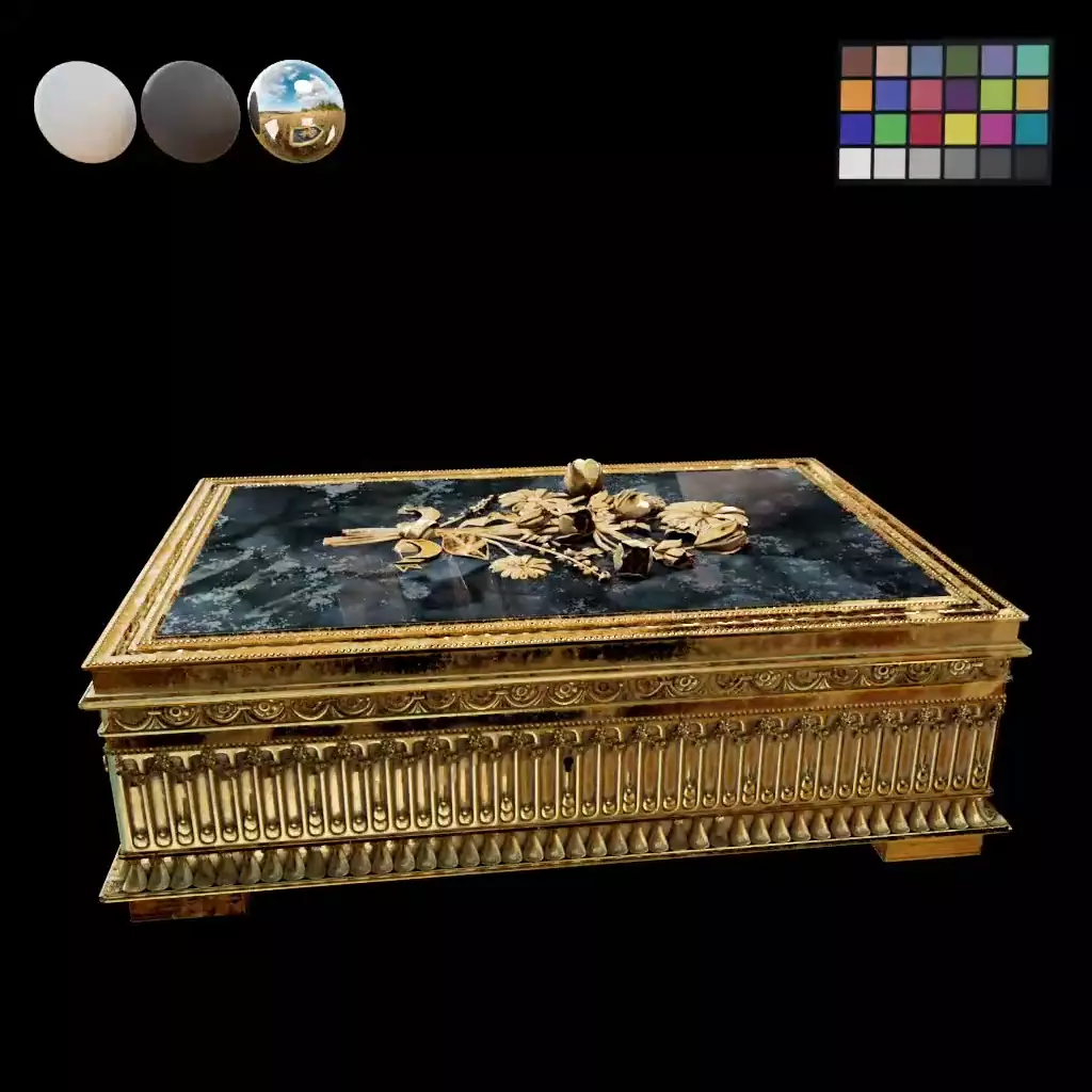 Details : Luxurious design with intricate ornamentation and floral details Clean topology with quad-based geometry Realistic aged gold texture for the box body, marble texture for the lid PBR shader setup for lifelike reflections and shadows Scene included without lighting or environment setup