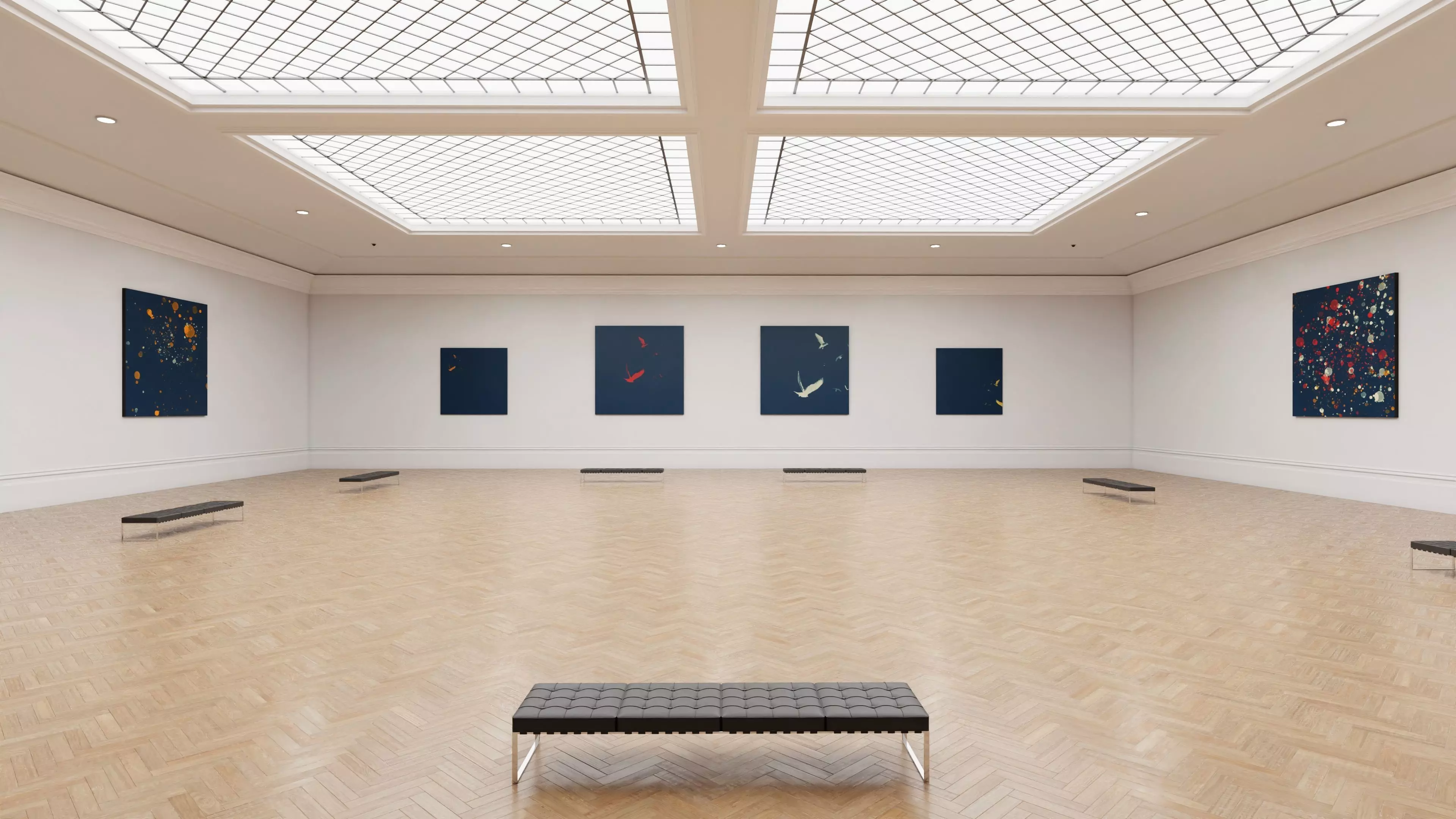 The model has clean and fairly low topology. The floor, ceiling, walls and paintings (front) are textured.The scene is lit by Emission material applied to Light mesh and emission material applied to Lamp_Round objects.Lighting is not baked to textures.