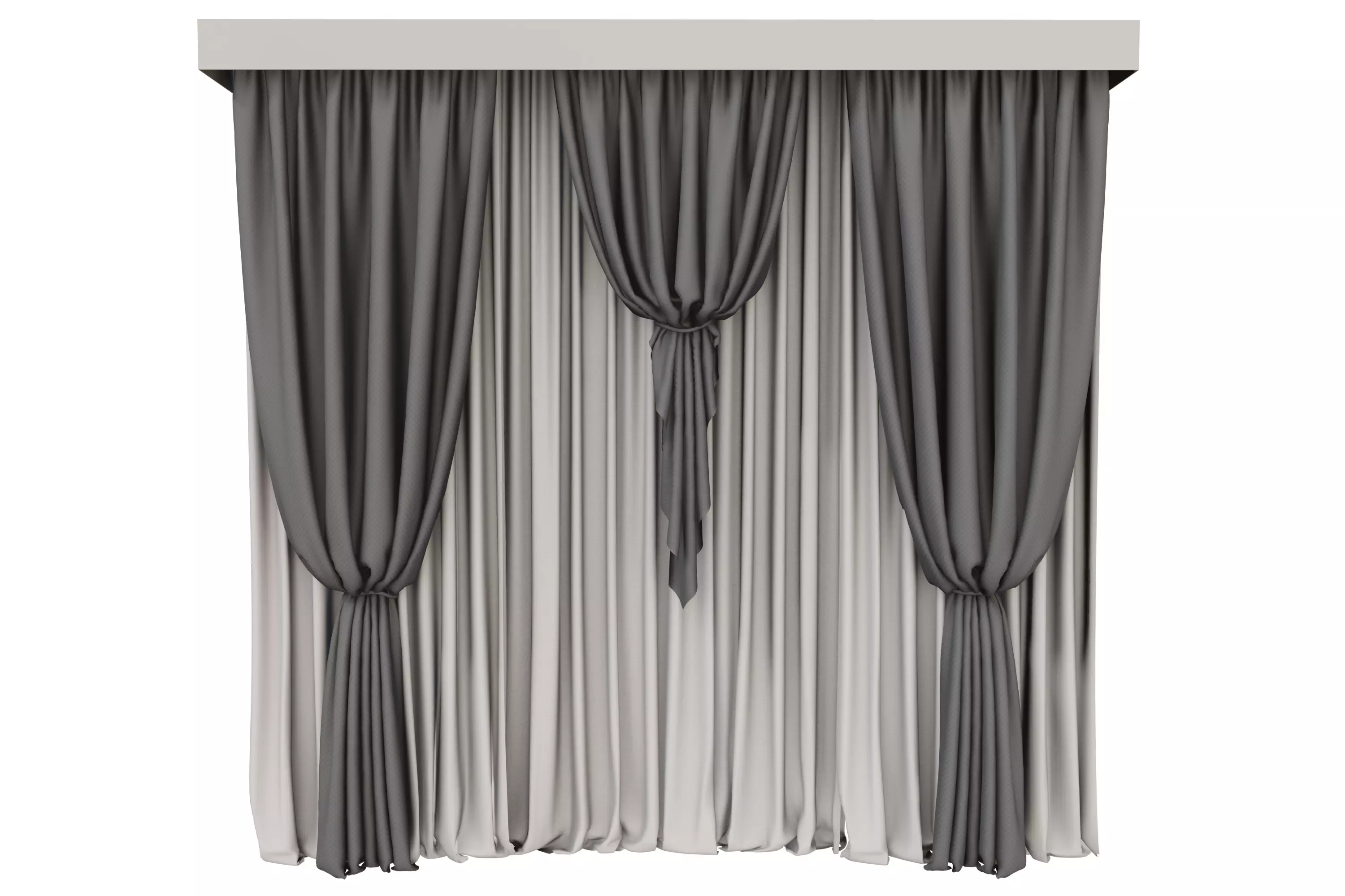 This is a detailed PBR (Physically Based Rendering) 3D model of a set of elegant window curtains, gracefully pulled back with matching tie-backs. The curtains are made from a light-colored, possibly sheer or semi-sheer fabric, with soft, natural-looking drapes and folds, suggesting a delicate yet rich texture. This versatile model is perfect for adding a touch of sophistication, privacy, or softness to bedrooms, living rooms, dining areas, or office spaces in architectural and interior design visualizations.