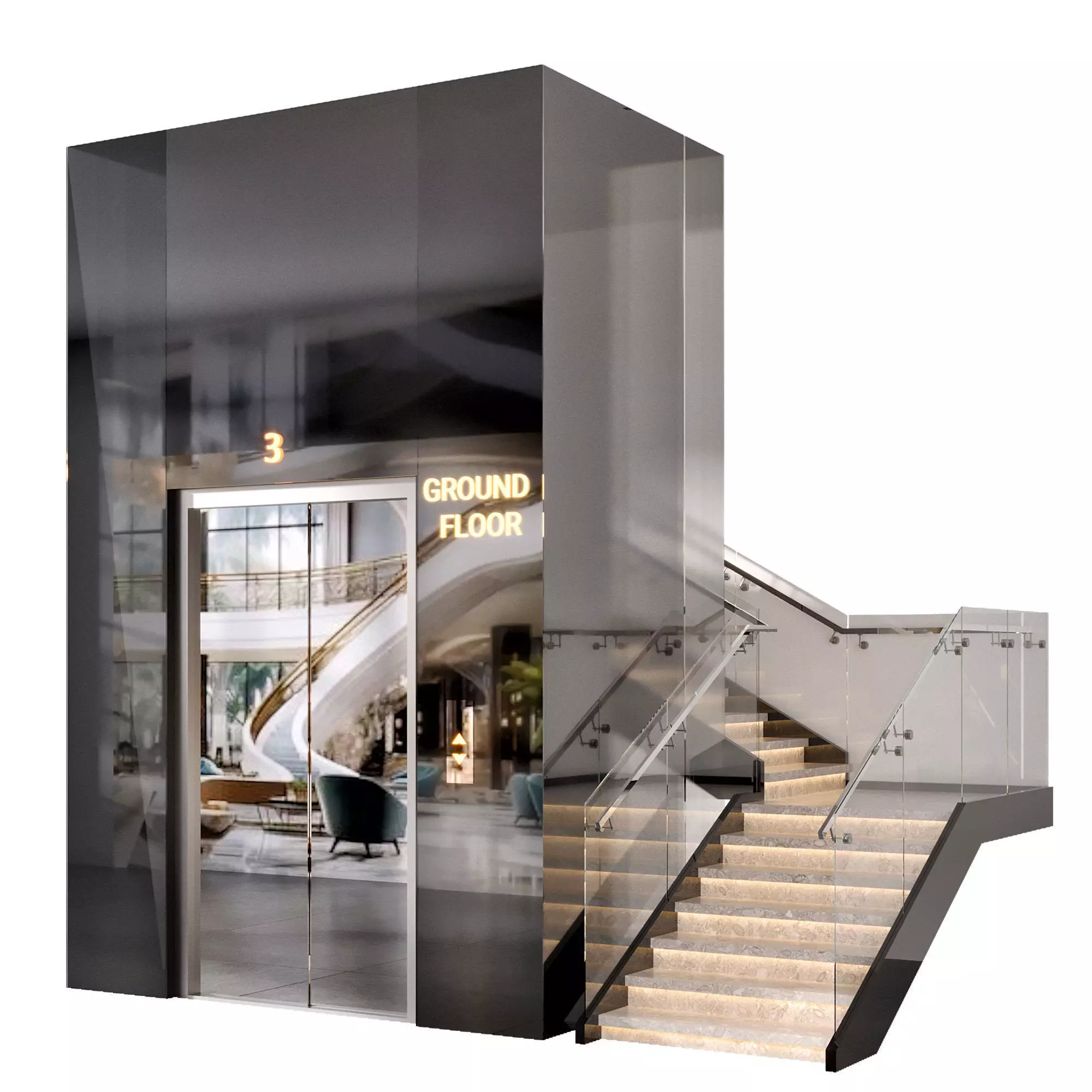 This high-quality 3D model showcases a luxury elevator core combined with an illuminated glass staircase, perfect for commercial and hospitality projects. The elevator features reflective black cladding and a realistic interior with signage, while the staircase includes transparent glass railings and integrated LED lighting for a premium architectural touch.