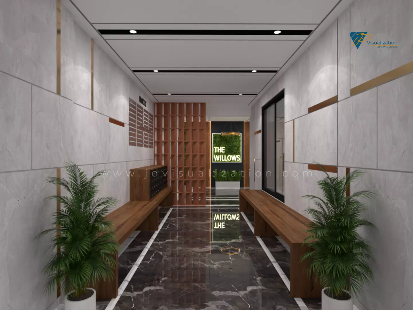 An earthy, green entrance lobby interior model of an apartment.