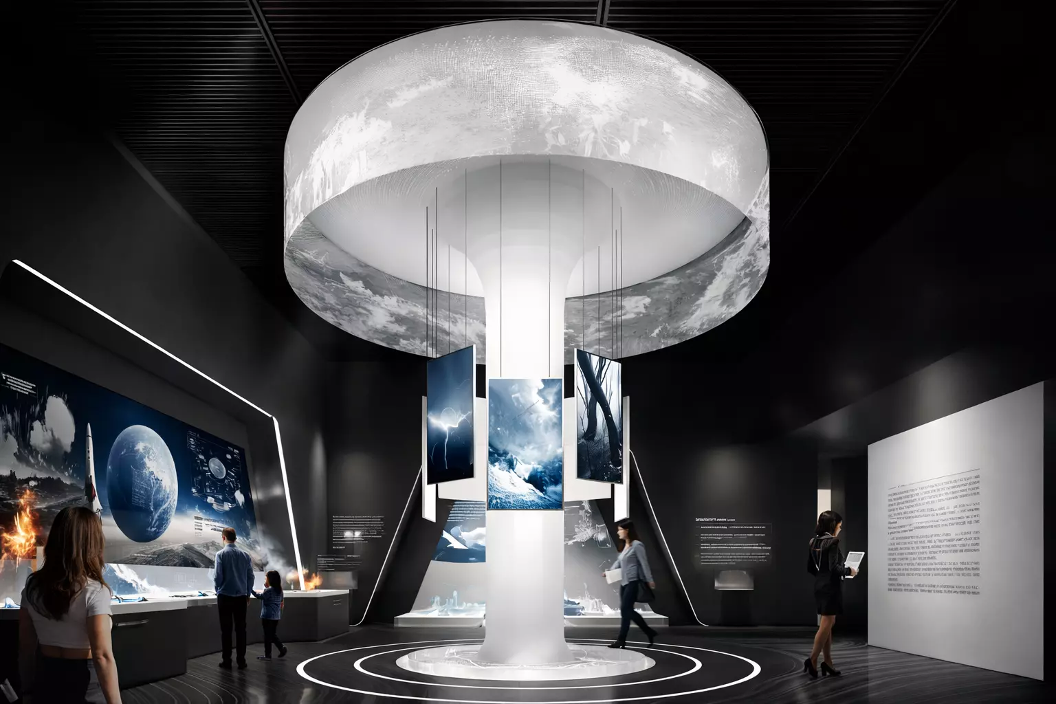 The contrast between dark surroundings and illuminated structures enhances focus and depth, making it ideal for corporate exhibitions, brand storytelling spaces, and museum environments.