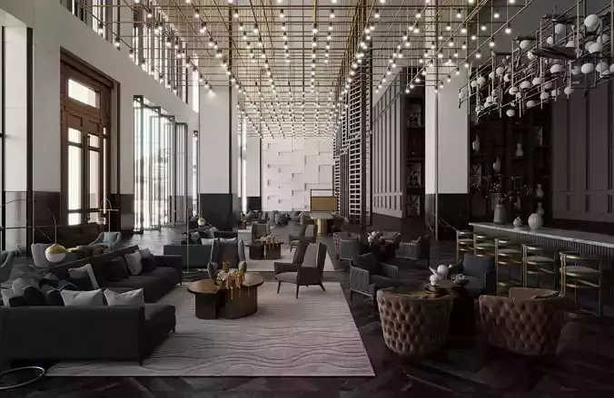 This opulent 3D model showcases a spacious modern hotel lobby lounge, featuring an array of comfortable seating arrangements including plush sofas in deep blues and grays, armchairs, and tufted benches arranged around artistic coffee tables with golden sculptures, books, and vases. The design incorporates tall bookshelves filled with decorative items, a sleek bar counter with gold-framed stools, intricate wall paneling in dark tones, and a dramatic ceiling installation with cascading pendant lights and grid-like fixtures for ambient illumination. Additional elements include a wavy patterned rug, potted plants, abstract wall art, and a mix of marble and wood surfaces, creating an elegant, inviting atmosphere for high-end hospitality settings. Perfect for interior design visualizations, virtual tours, architectural renders, or luxury hotel simulations. Optimized with high-quality textures for fabrics, metals, glass, and lighting effects.
