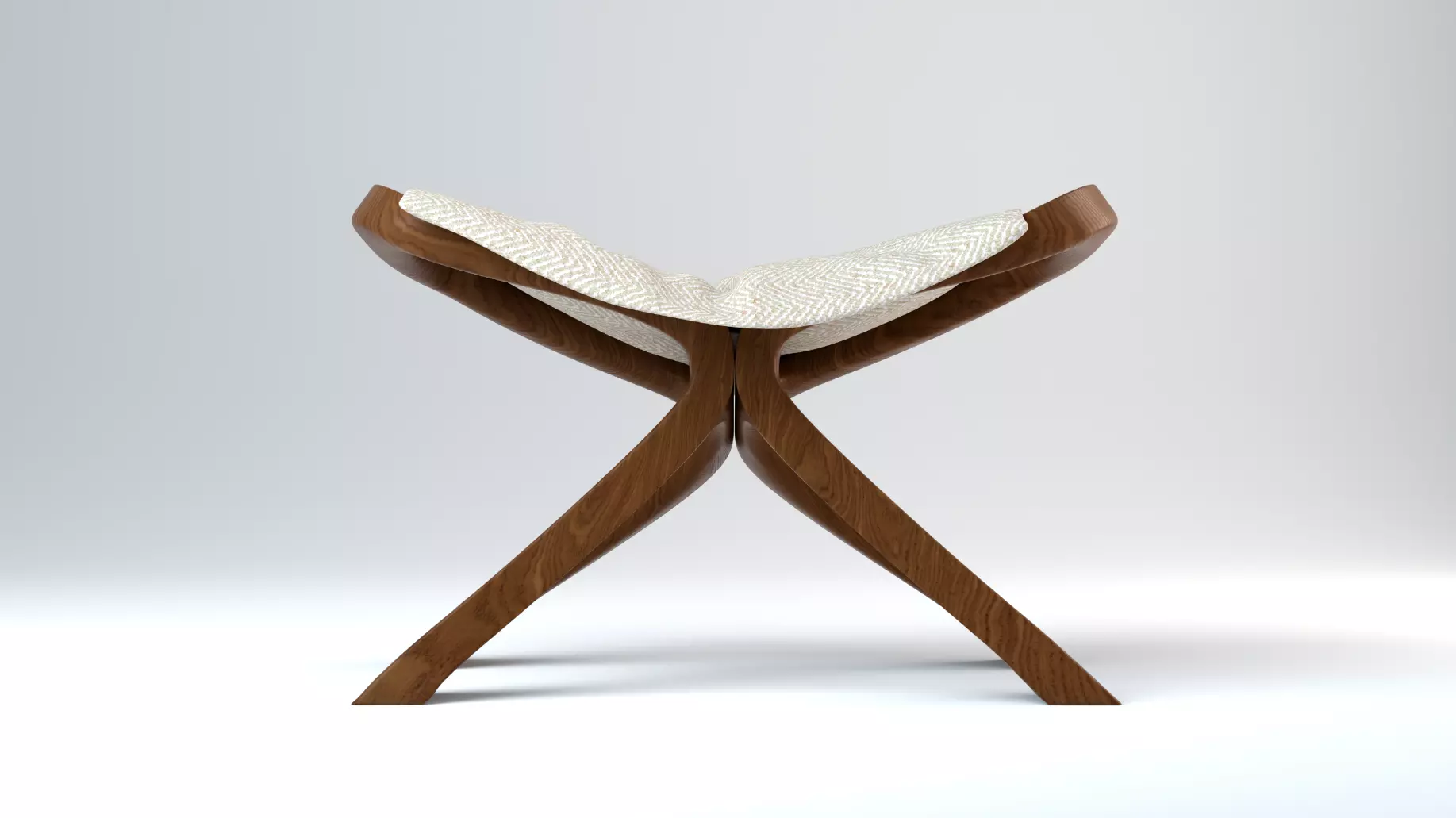 This modern sculpted wooden stool 3D model features a distinctive X‑shaped base with smooth organic curves, ideal as an accent stool, ottoman, or bench in contemporary living rooms, bedrooms, and lounge interiors. The model includes a detailed woven fabric seat with subtle folds and a soft herringbone pattern, perfect for close‑up renders and product shots.