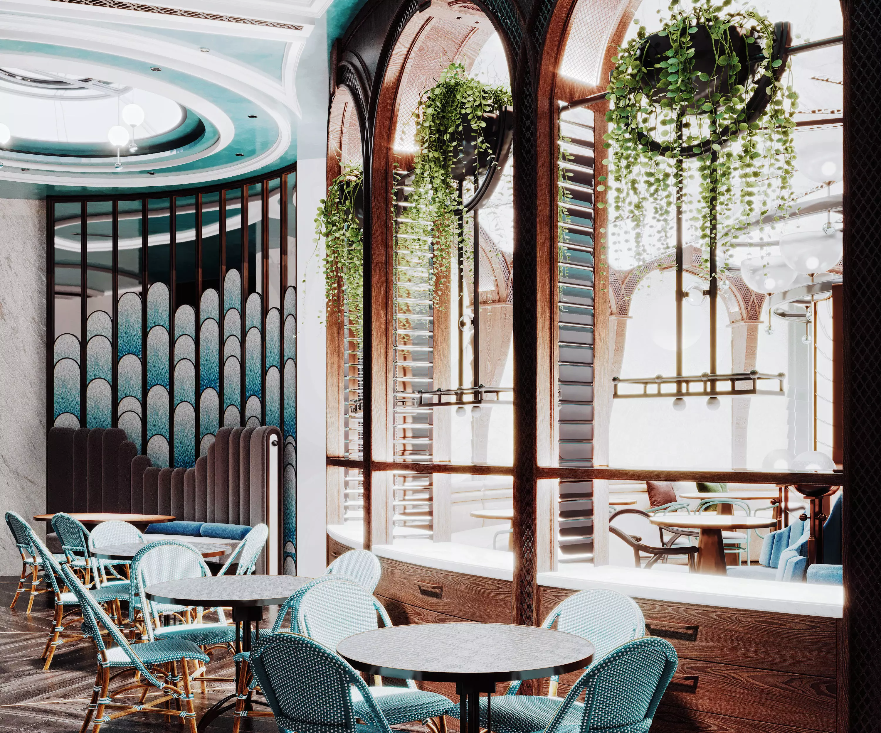 This 3D model represents a luxurious modern Art Deco café interior designed with a refined blend of vintage charm and contemporary style. The space features soft turquoise and teal tones, bold geometric elements, and elegant textures that are perfect for high-end visualization projects.