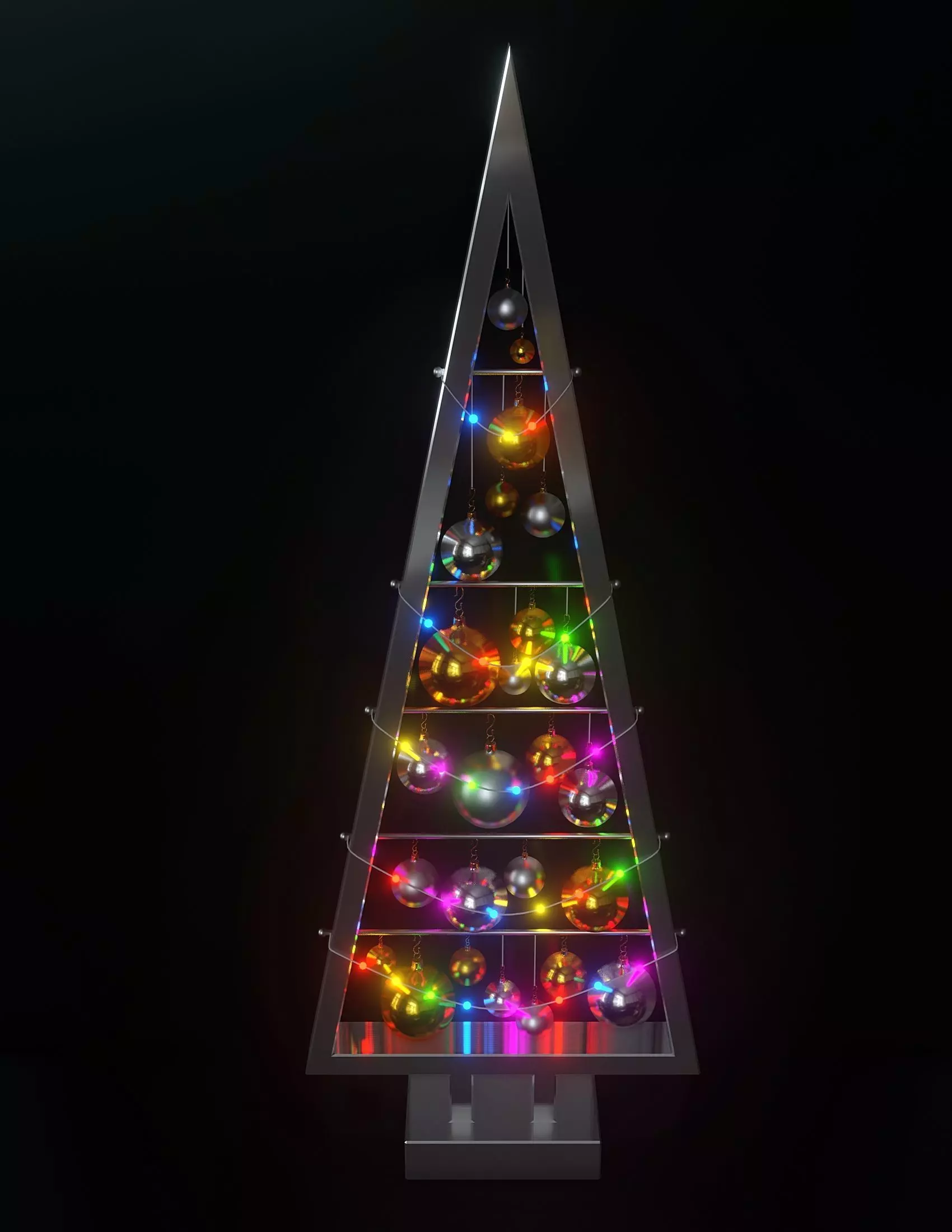 Modern Christmas tree with toys and lighting. All parts of the model are combined into one object. Textures were not used. (Such a result as in the picture is possible when applying the blender program using the eevee renderer.)