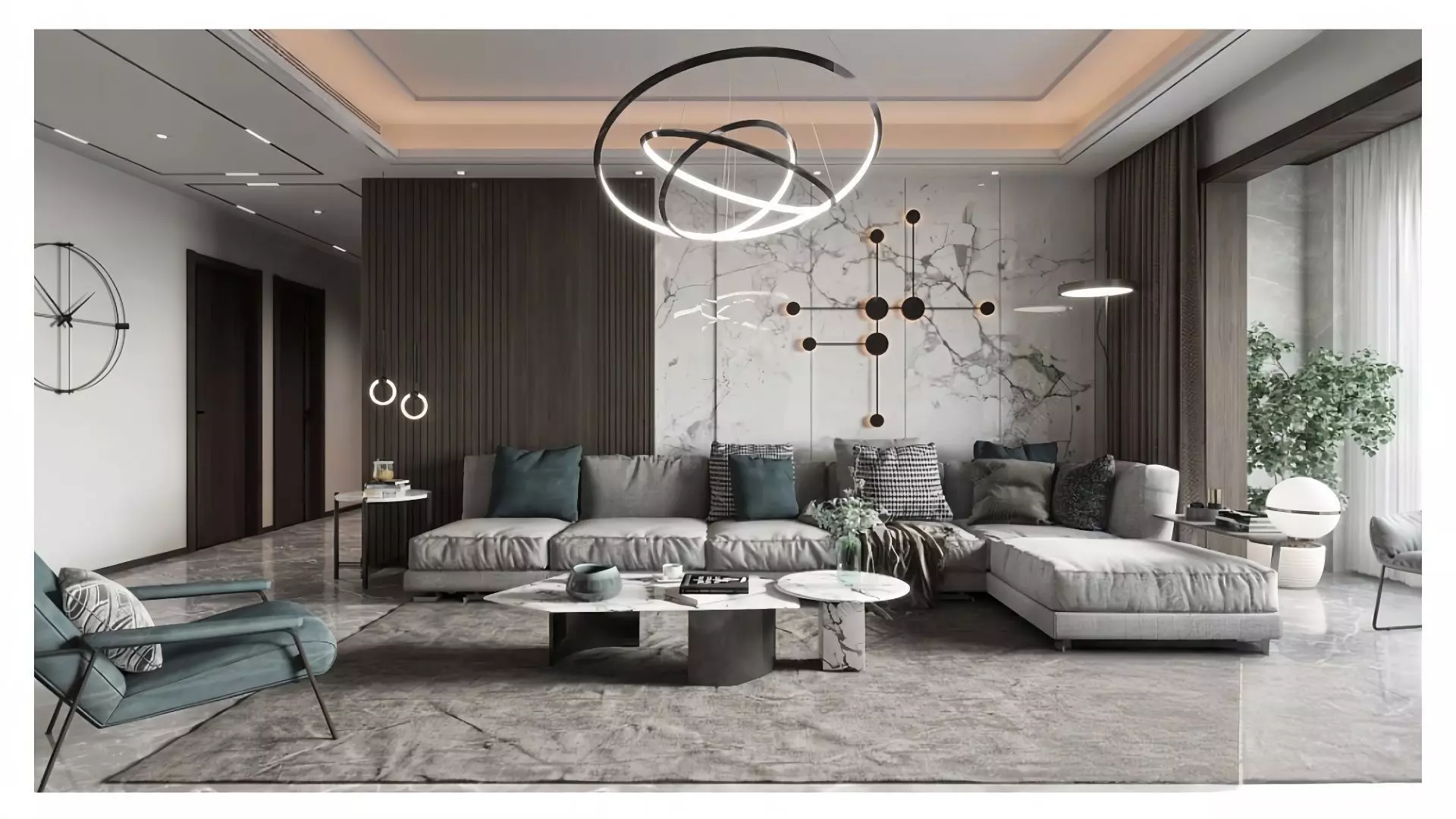 This living room is a typical example of modern light luxury style: it mainly uses low-saturation gray and white as the overall tone, with dark brown wooden grilles and dark green soft furnishings as layered accents, creating a high-end texture without being dull.The details in the space are very memorable: the floating ceiling combined with the no-main-light design makes the ceiling lighter, and the circular layered chandelier serves as the visual focal point; half of the background wall is made of wooden grilles and the other half features marble texture, softening the cold and rigid feeling; the L-shaped upholstered sofa is matched with a combined marble coffee table, and together with soft furnishings with metal lines (such as the frame of the single chair), it perfectly balances the delicacy of light and the texture of luxury, creating an overall atmosphere that is relaxed and transparent.