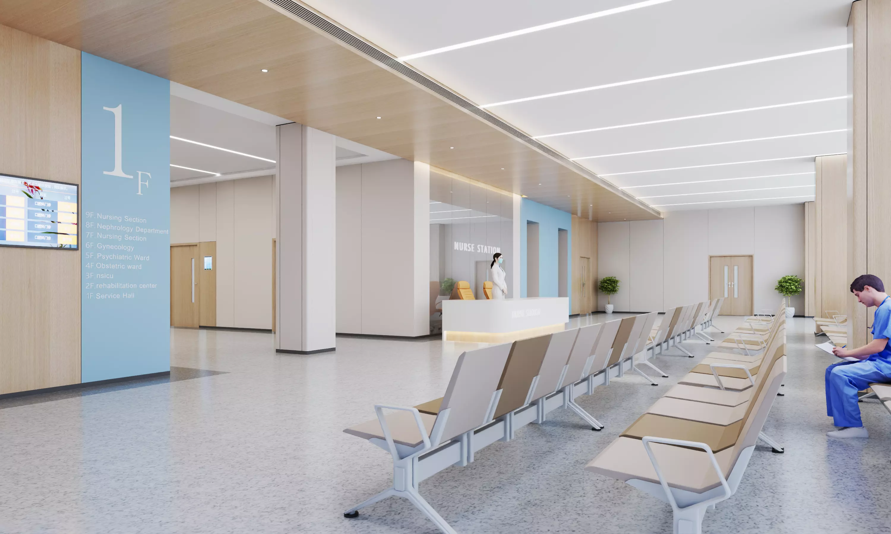 Professional Modern Hospital 1F Lobby & Nurse Station SceneA premium, photorealistic 3D model of a modern hospital entrance lobby and nurse station. This scene is meticulously designed with a warm wood-accented ceiling, integrated professional lighting, and a clear wayfinding signage system (1F), perfect for high-end healthcare architectural visualizations and medical simulations.Key Features:Functional Zoning: Includes a complete nurse station desk, multiple rows of modern waiting chairs, and detailed architectural signage.High-End Atmosphere: Features a sophisticated interior design with light wood textures and a sterile, professional clinic environment.Ready-to-Render: Fully set up with V-Ray materials, professional lighting, and camera settings for 3ds Max.Multi-Format Export: Optimized FBX and OBJ formats included for seamless integration into Blender, Maya, Unity, and Unreal Engine.Technical Specifications:Native Software: 3ds Max (V-Ray materials included)Export Formats: .MAX, .FBX, .OBJScale: Real-world scale (Metric units)Textures: All high-resolution PBR textures and signage maps included.