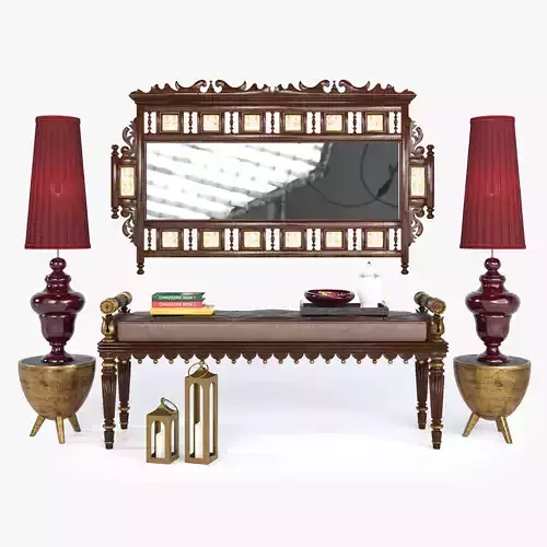 REGENCY STYLE HALLWAY inspired by Asia traditional furniture. Aakriti Wall Mirror handcrafted by skilled artisans with Dhokra Art Work and finished in Walnut Color.