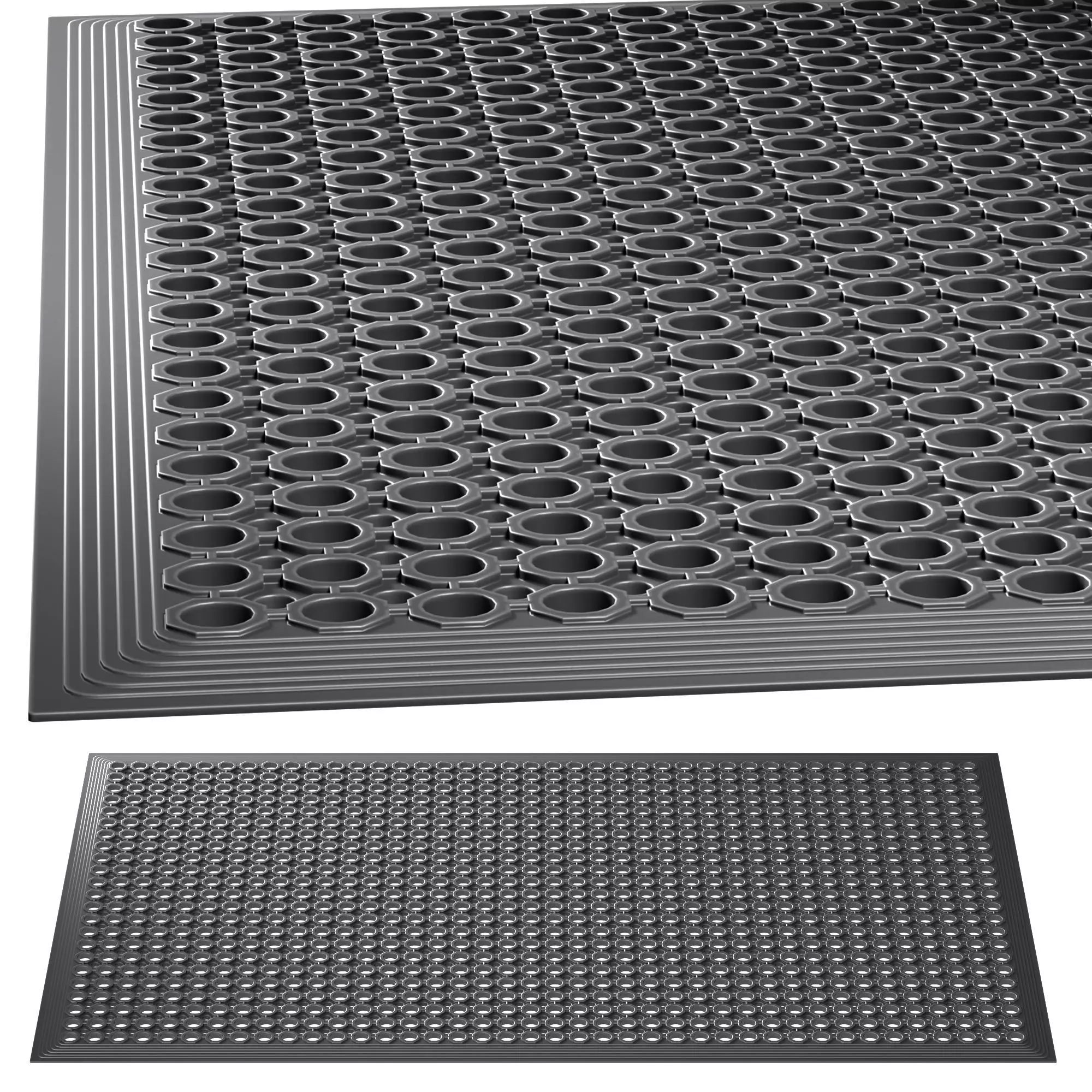 Rectangular black rubber floor mat with holes.The model has a clean topology.The model is not for smoothing.The model was originally prepared for V-ray. The Corona version was obtained by conversion and subsequent refinement.The model materials use the VRayEdgesTex and CoronaRoundEdges procedural maps to smooth corners on the render instead of the chamfer.