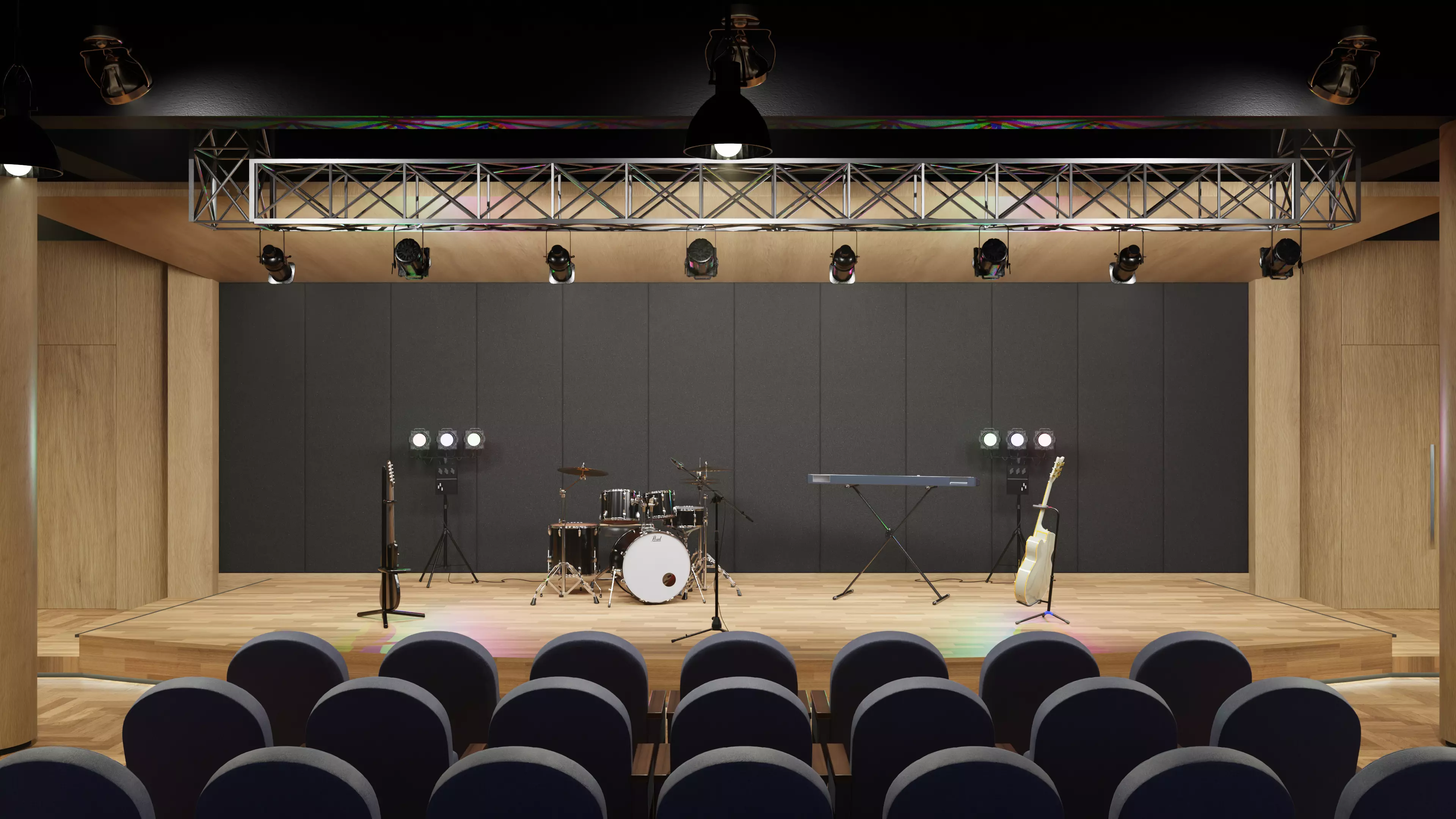 This interior visualization showcases a modern, multi-functional performance hall designed with a sophisticated balance of acoustic functionality and contemporary aesthetics. The space is expertly divided into a professional stage area and a tiered audience section, making it ideal for live music, corporate presentations, or intimate theater performances.Stage and Technical EquipmentThe stage features a warm, natural wood finish that extends from the flooring to the side architectural elements. It is fully equipped for a live band, displaying a drum kit, digital keyboard, and guitars. A prominent aluminum truss system hangs overhead, supporting a professional lighting rig with adjustable spotlights aimed to create dynamic visual effects. To enhance the performer's experience, floor monitors are positioned at the stage edge, while additional light stands provide ambient background illumination against a sleek, dark charcoal acoustic back panel.Audience Area and AcousticsThe seating area consists of ergonomic, high-back upholstered chairs in a muted navy blue, arranged to ensure clear sightlines to the stage. One of the most striking architectural features is the ceiling design over the seating area: a series of angled white acoustic baffles that serve both a functional purpose—managing sound reflections—and a decorative one, creating a sense of movement. A large wood-paneled structural column grounds the space, blending seamlessly with the parquet flooring.Lighting and AtmosphereThe lighting scheme is layered, combining industrial-style black pendant lights for general ambiance with professional stage spots. Large floor-to-ceiling windows on one side suggest the venue is located in an urban setting, offering a glimpse of a city skyline that adds to the high-end lounge or private club atmosphere. The overall design communicates a sense of professionalism and warmth, where every detail—from the textures of the wood to the placement of the microphones—is optimized for a premium auditory and visual experience.
