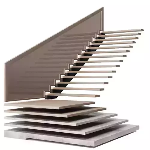 The original staircase in a modern style. Perfectly fit into many interiors. The staircase is made of wood and stone, the railings are made of wood and glass. The railings are also illuminated.Good renders!