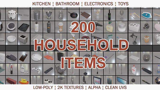 This pack contains 200 low-poly yet detailed models of regular household items. This includes objects that would typically fill up the kitchen, bathroom, bedroom, study and living spaces around a house. Use this pack to bring more life and clutter to your home renders, games, or for any of your art pieces.