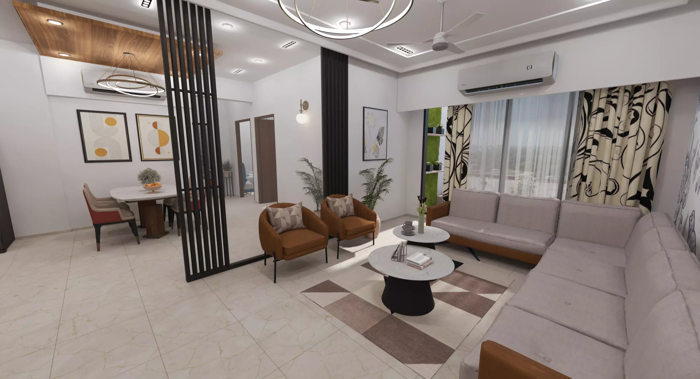 - 3D model of a 3 BHK apartment with interior assets and textures.