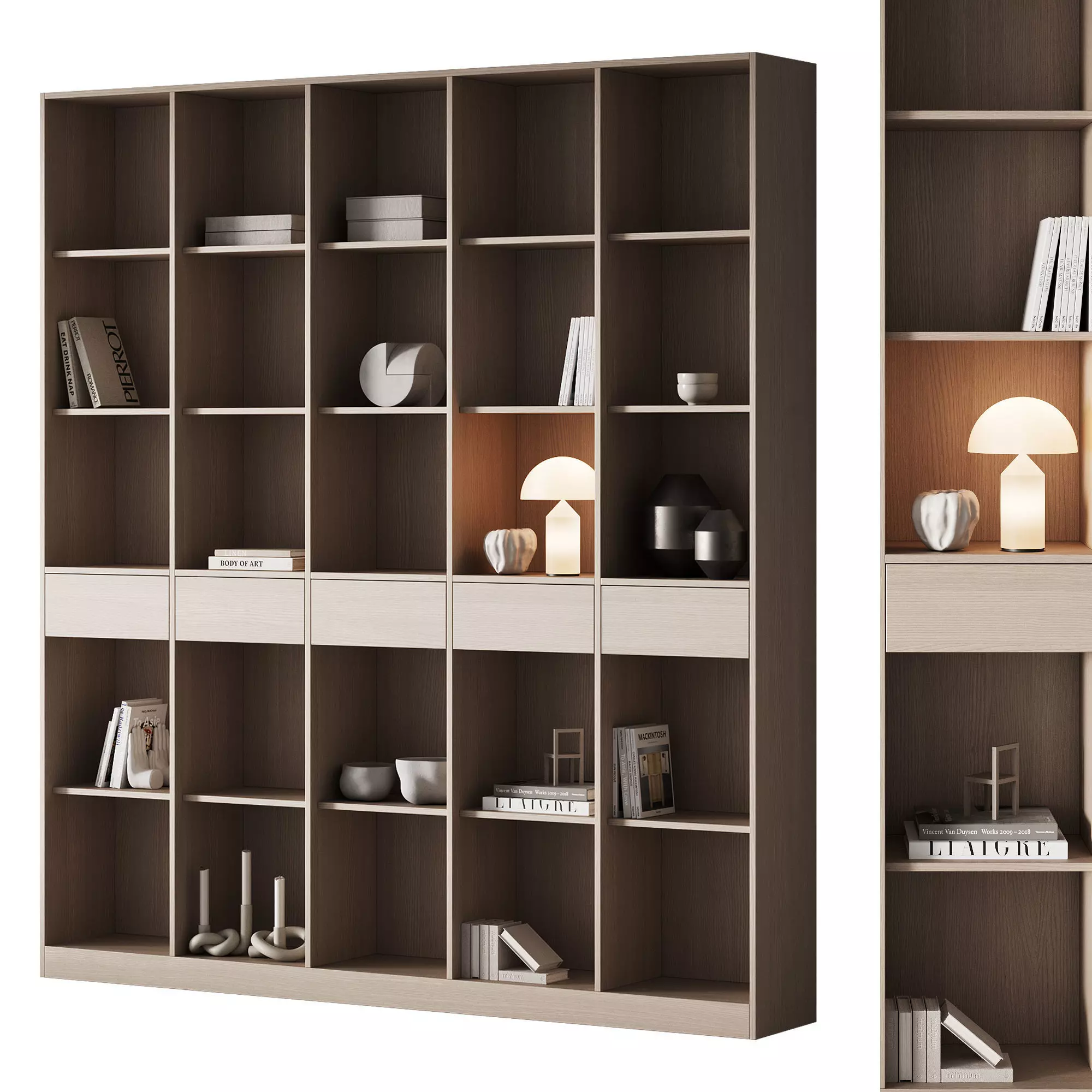 3d model: built-in / modular / wall rack / book shelf filled with decor.Table lamp oluce Atollo glass 236 (S)Candle and candle holder CB2 Asha White Knotted Double Taper Candle Holder, CB2 Asha Speckled Cement Knotted Taper Candle HolderVase Fredericia Hydro Brass Vase H30 by By Sofie OsterbyFredericia Leather Box By August SandgrenVases, books, decorative sculptureAll books are made in original sizes, which can be found and purchased on Amazon. The names are indicated inside (in the names of objects and materials)