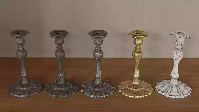 Antique metal candle stic. Stands 27cm tall. Features a clean quadbased mesh, low poly (7671 faces) with Normal map baked from high poly model.