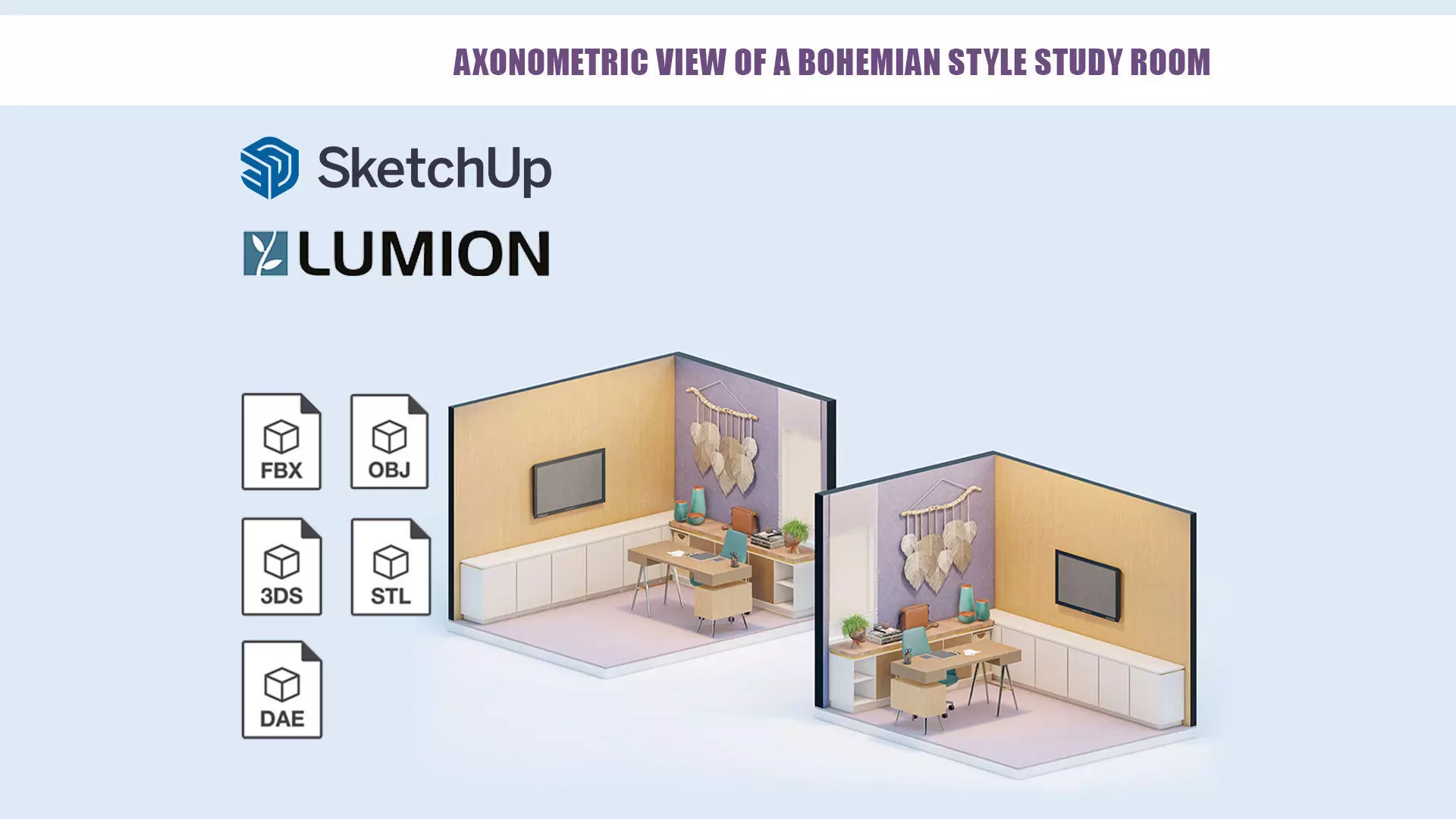 Axonometric view of a Bohemian style study room cum workstation 3d model is designed in Sketchup in standard sizes. The study room features a smart LED tv and ample storage cabinets. This workstation with macrame wall hangings , indoor plants and pottery adds the perfect coziness for 'work from home' setting for people who want to work from home. This carefree aesthetic workspace has a mix of contrasting textures and minimal patterns.