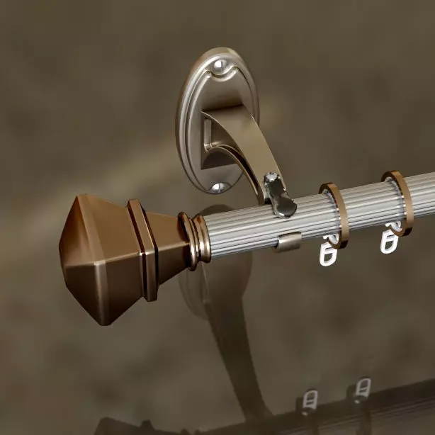 Bracket and finial for curtain rods. Modern,ArtDeco style.Selection of the finial can take into consideration fabric pattern style and interior design.Using scaling, the finial can also be used as a separate art object.Bracket Bracket: 98x46x118mm.Finial Pyramid:43x43x64