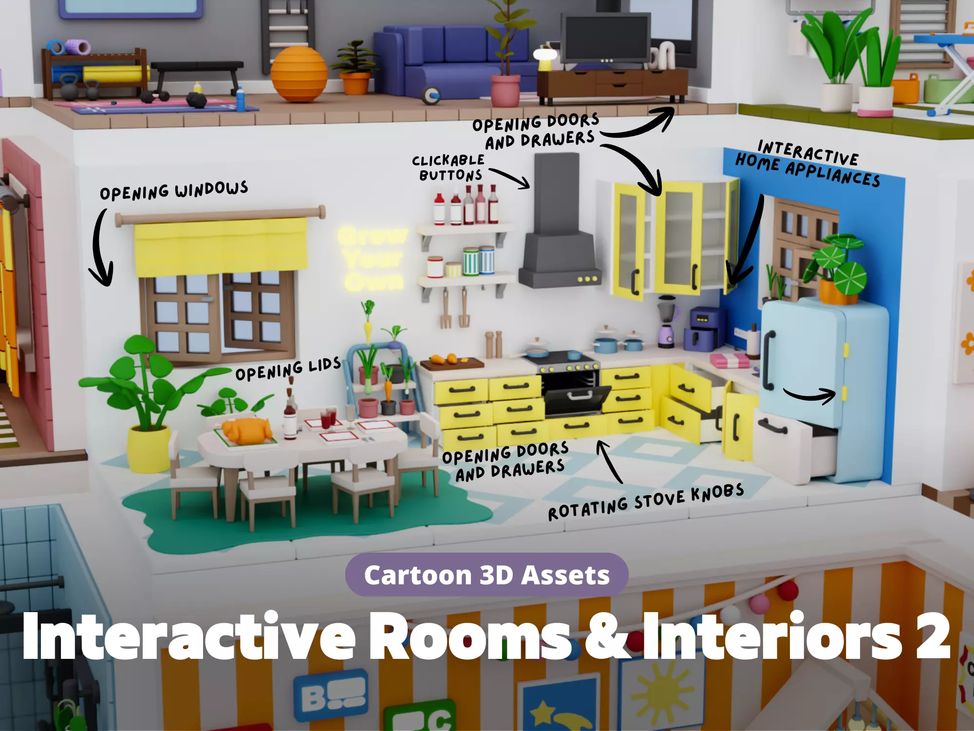 Interactive 3D interiors with fully editable scenes and hundreds of modular, customizable props. Includes opening doors, windows, drawers, rotating elements and more - perfect for any project.