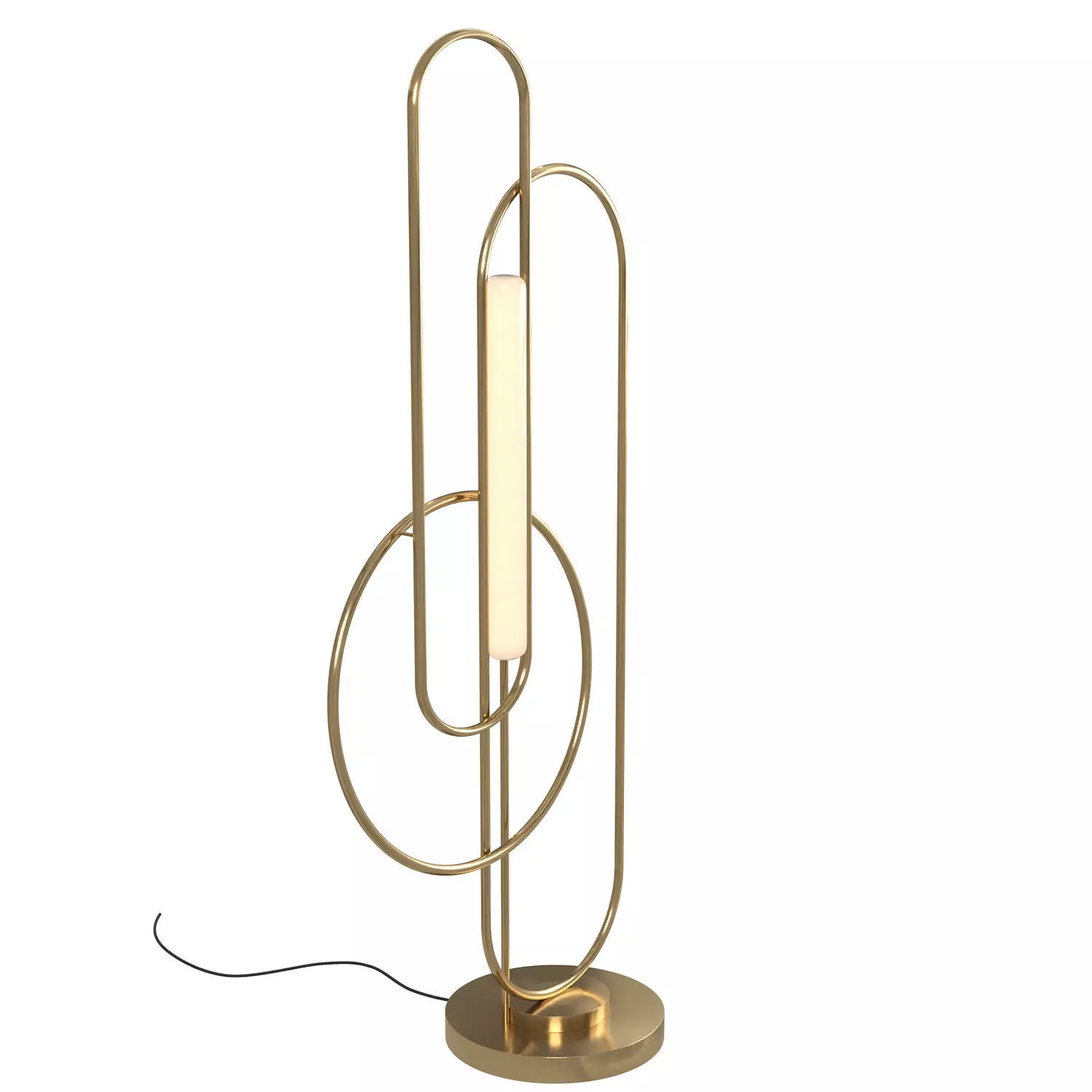 A contemporary sculptural floor lamp built around a refined geometric composition of brass tubular frames and a central vertical opal light tube.The design plays with overlapping curves and linear elements, creating a strong visual rhythm while maintaining an elegant and lightweight silhouette.