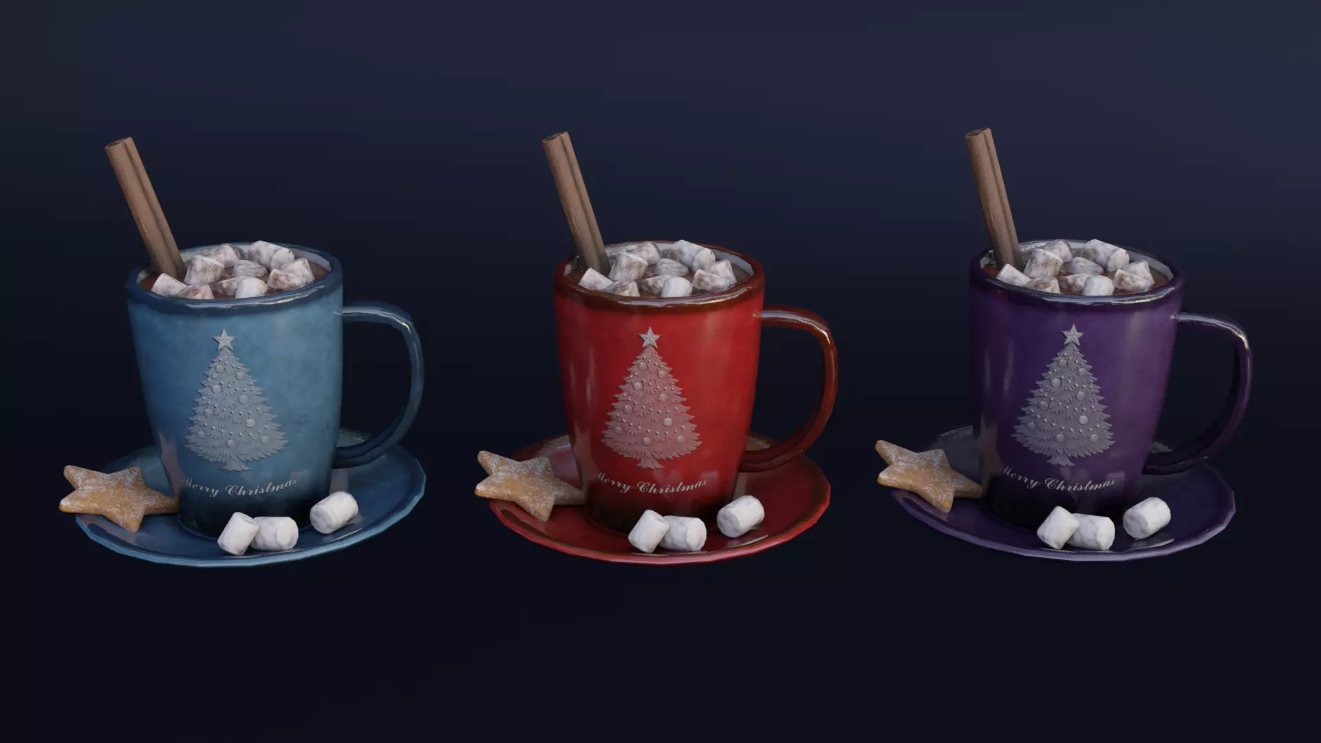 Placed together, the three mugs create a small scene that could belong in a kitchen, a café, or a decorated living room. The set works well for holiday interior renders, winter market stalls, cozy storytelling environments, or game scenes where seasonal props help build atmosphere. Each mug variation shares the same structure but carries its own color personality, making them useful both as a group and individually.