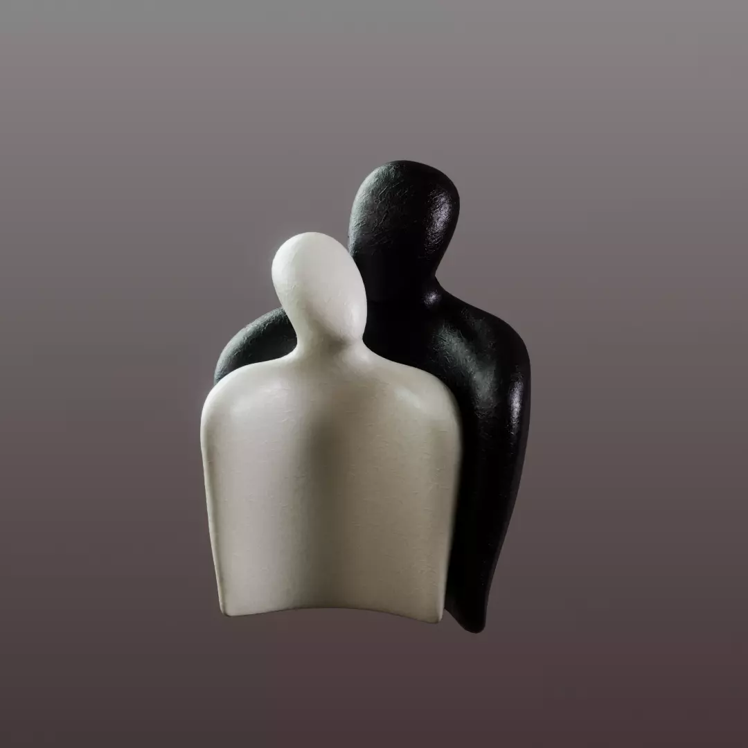 his minimalist figurine captures the warm, intimate essence of two abstract human forms leaning into one another. Crafted with smooth, stylized geometry and a contrasting dual-tone finish, the sculpture beautifully represents connection, comfort, and unity.Its clean silhouette makes it ideal for interior renders, product visualization, architectural scenes, or artistic compositions that need a symbolic emotional touch.The model features optimized topology suitable for both close-up shots and real-time applications. Materials are simple and lightweight, ensuring quick render setups and compatibility across major 3D pipelines.Perfect as a decorative asset or part of a larger collection of abstract sculptures.