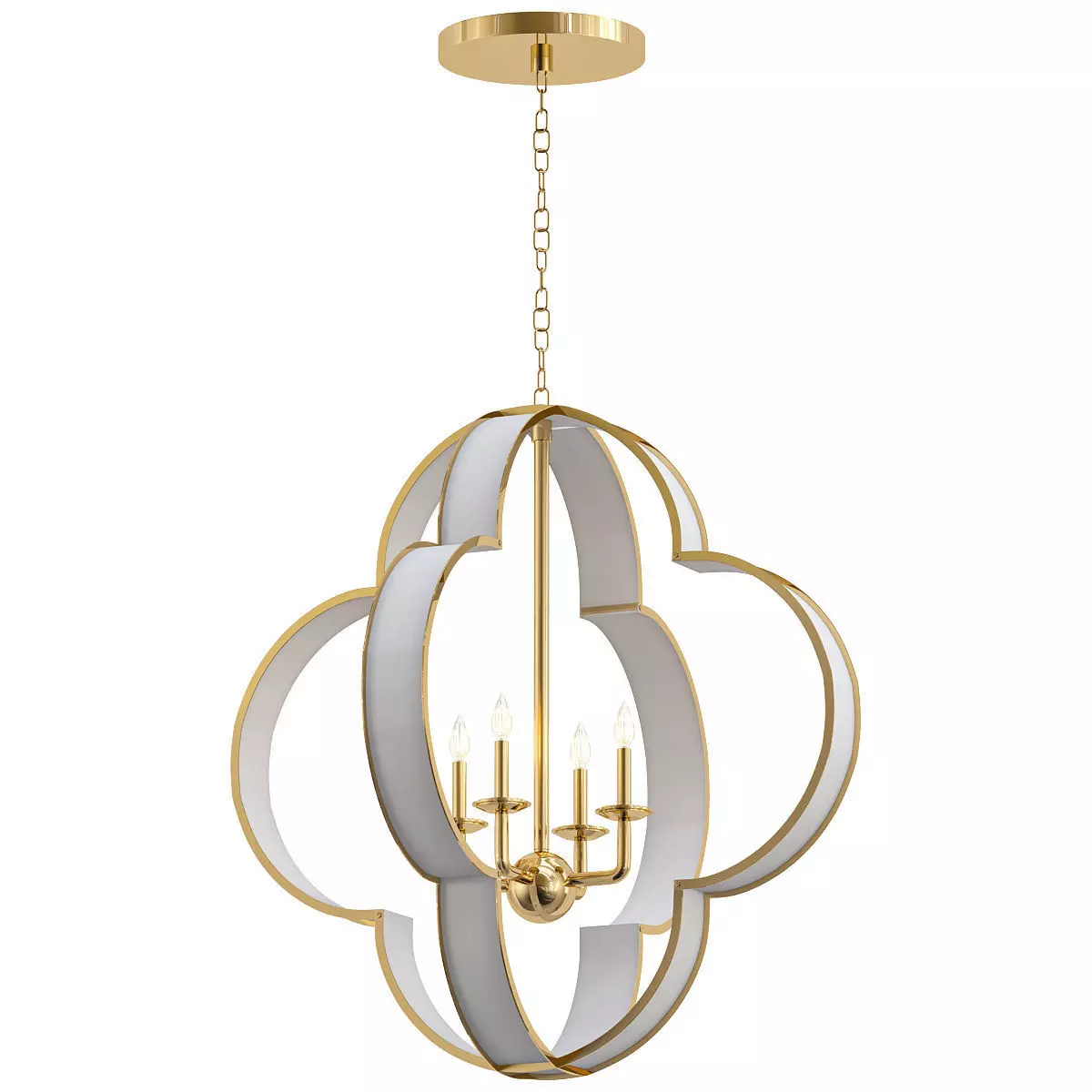 Люстра Палмер имеет классический силуэт в виде четырехлистника и создаст стильный образ в прихожей, столовой или дамской комнате. Металлический каркас светильника отделан полированной латунью и расписан кремовым цветом.