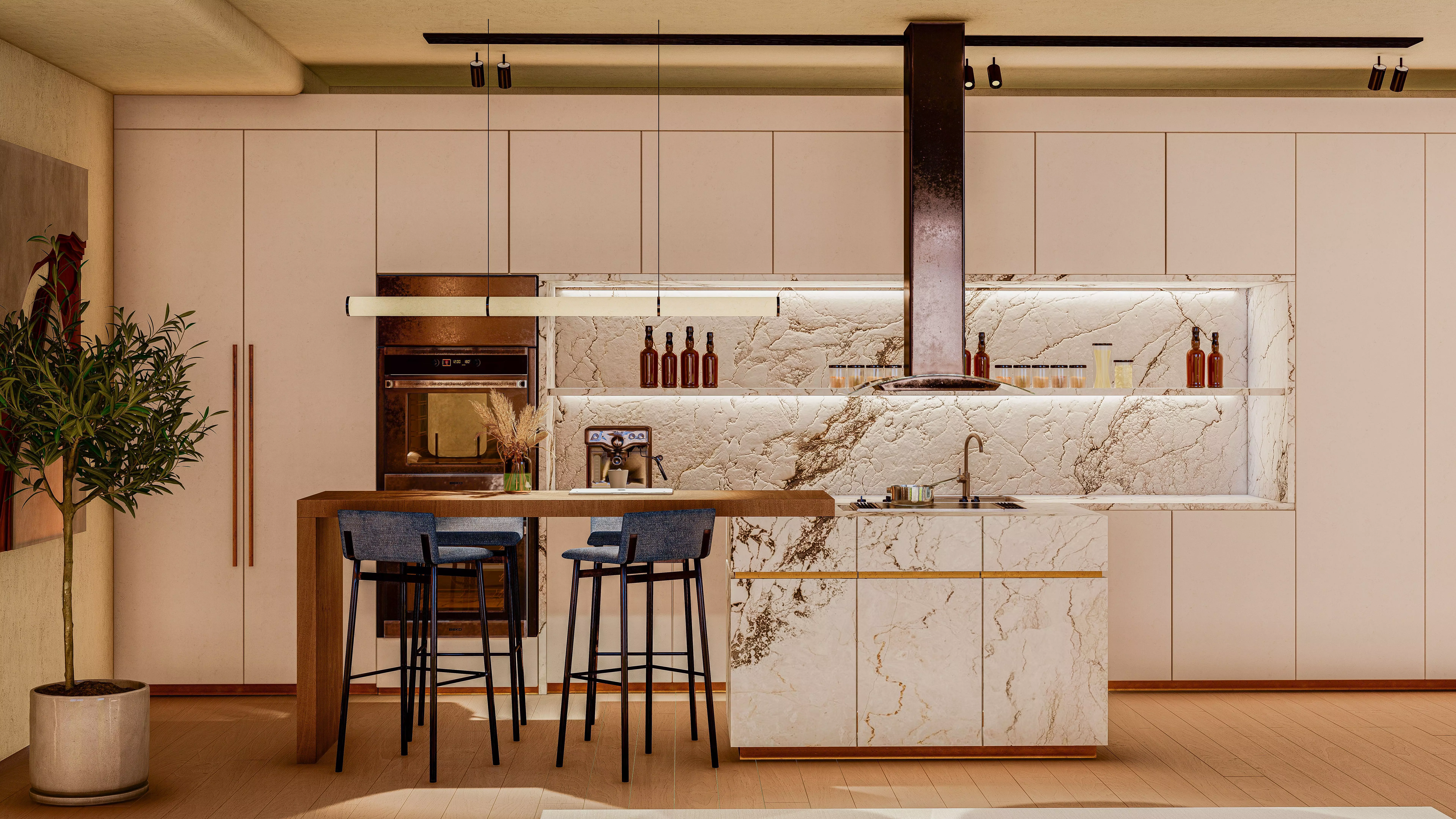 un impresionante modelo 3D de un apartamento de lujo que incluye una lujosa cocina, un sofisticado comedor y una cautivadora sala de estar. Meticulosamente diseñada y renderizada con Lumion en el pináculo de la calidad, esta obra maestra virtual da vida a una sensación incomparable de elegancia y grandeza.