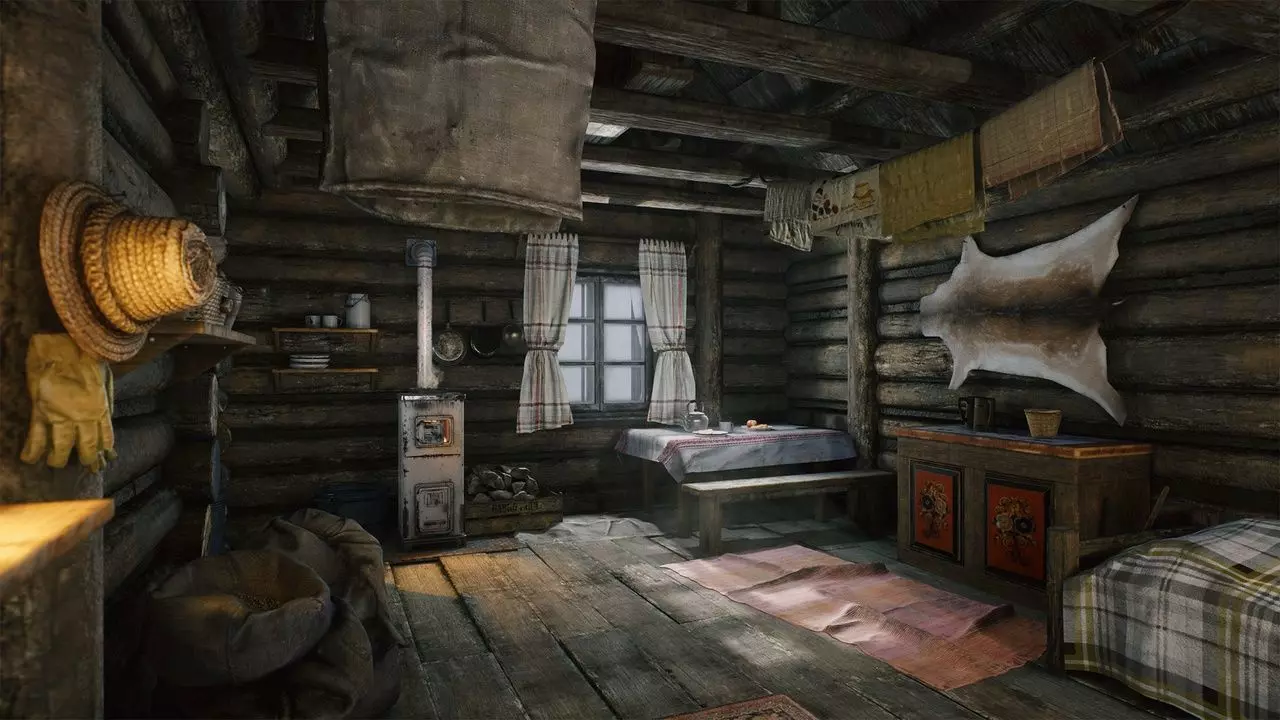 A popular, well-known, beautifully crafted, atmospheric forest environment piece, featuring a cozy log cabin with its interior, fully furnished, available in winter/snowy and summer/dry versions.