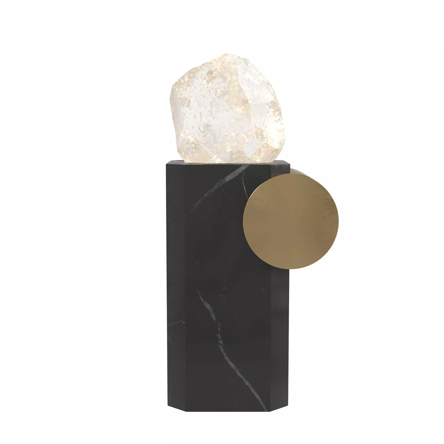 Features:Sculptural table lamp with raw crystal diffuserSolid black marble base with natural veiningBrushed brass side detailSoft, atmospheric light diffusionContemporary luxury aesthetic