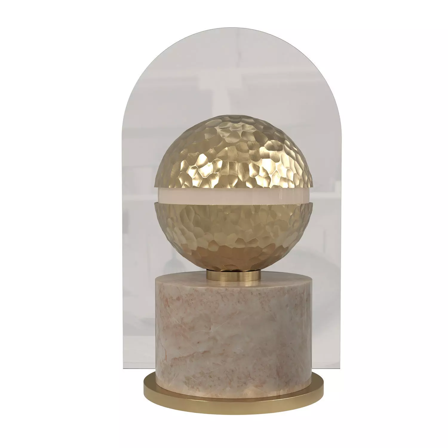 A refined luxury table lamp combining noble materials and a timeless architectural composition.The design features a hammered brass spherical diffuser, delicately split by a horizontal opaline band that softly diffuses the light. The sphere rests on a solid natural marble base, framed by a minimalist brass ring, and enhanced by a subtle arched glass backdrop that adds depth and elegance to the silhouette.