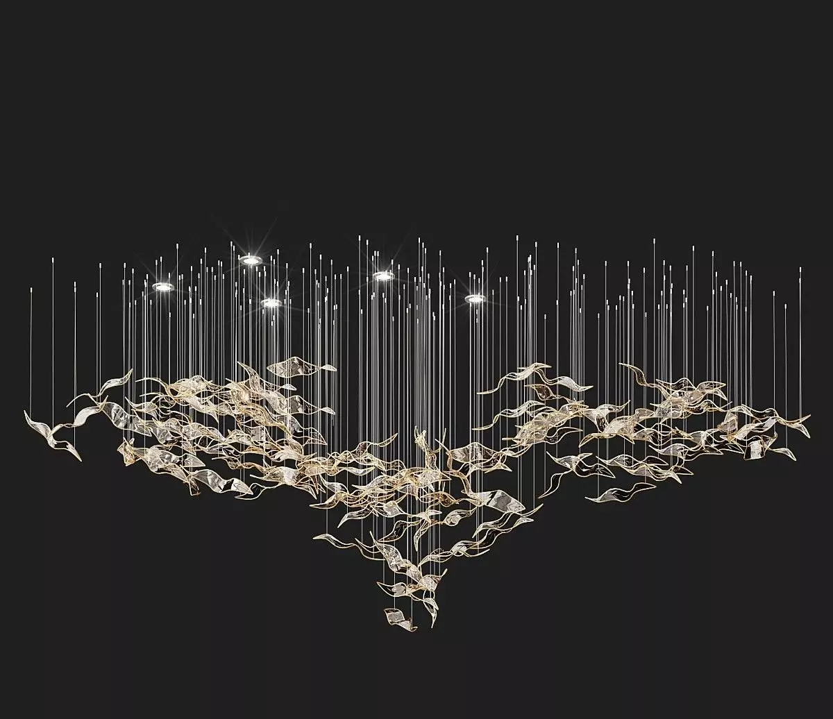 Make a breathtaking statement in your luxury interior visualizations with this stunning modern sculptural chandelier. This photorealistic 3D model features a dynamic, gravity-defying arrangement of delicate glass and gold elements that elegantly resemble a flock of flying birds or abstract leaves floating in mid-air. Illuminated by subtle, integrated LED downlights suspended from ultra-fine wires, this expansive lighting fixture is the ultimate centerpiece for grand hotel lobbies, opulent dining rooms, or high-end residential spaces. Fully optimized and render-ready for seamless integration into your workflows utilizing 3ds Max with Corona and V-Ray, this premium asset instantly adds unparalleled elegance and a magical, luminous atmosphere to your most sophisticated ArchViz projects.