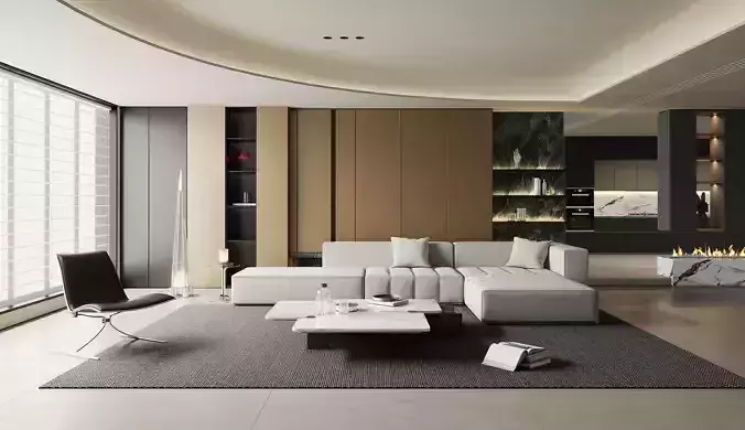 Modern Minimalist Living Area With Open Kitchen 3D model