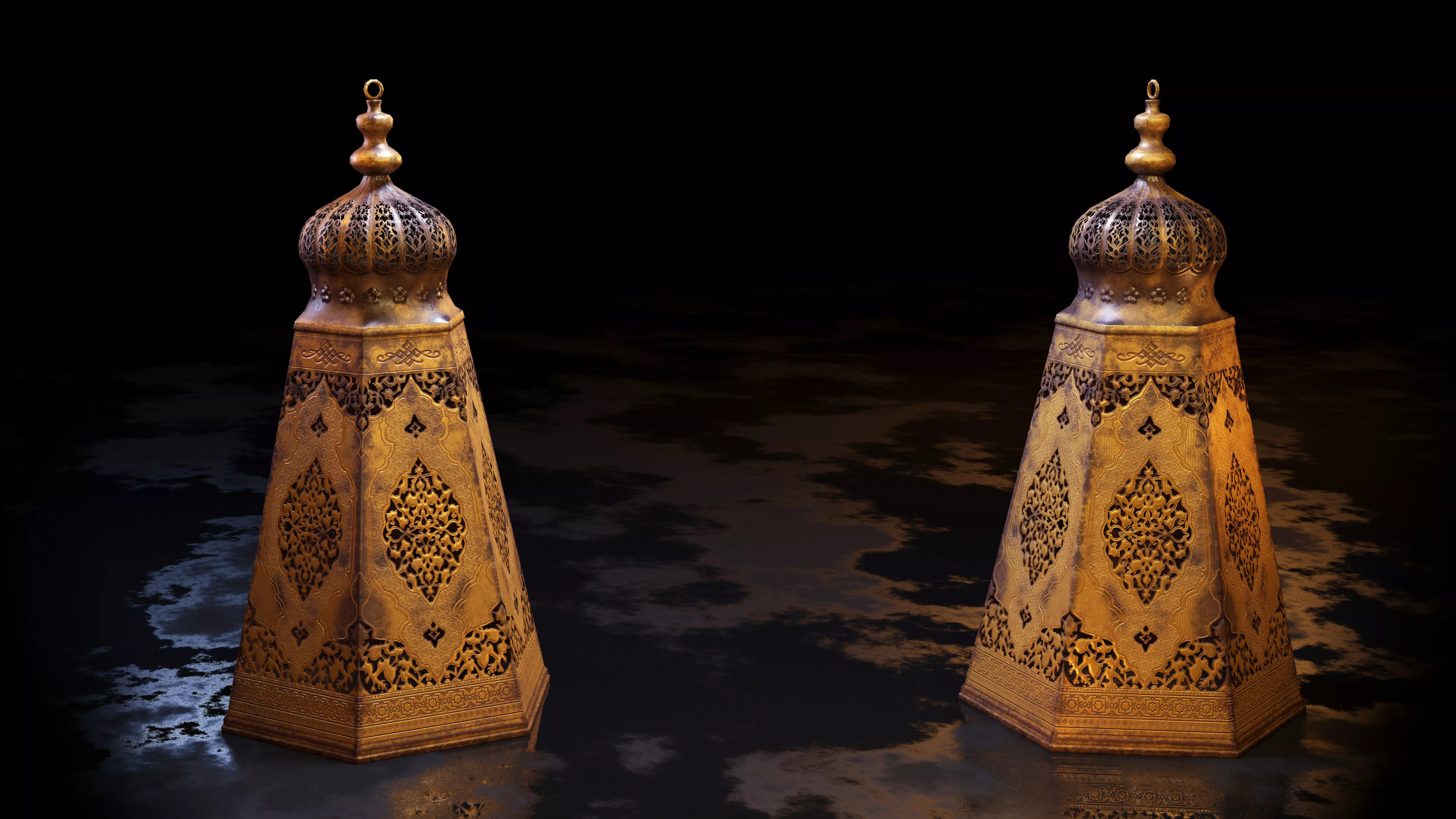 The lantern's ornate cut-out details and gold-toned finish evoke the elegance of traditional Moroccan and Islamic architecture, making it ideal for use in medieval marketplaces, luxurious palaces, or outdoor courtyards. With optimized performance across real-time applications and cinematic renders, this asset is both versatile and visually striking.