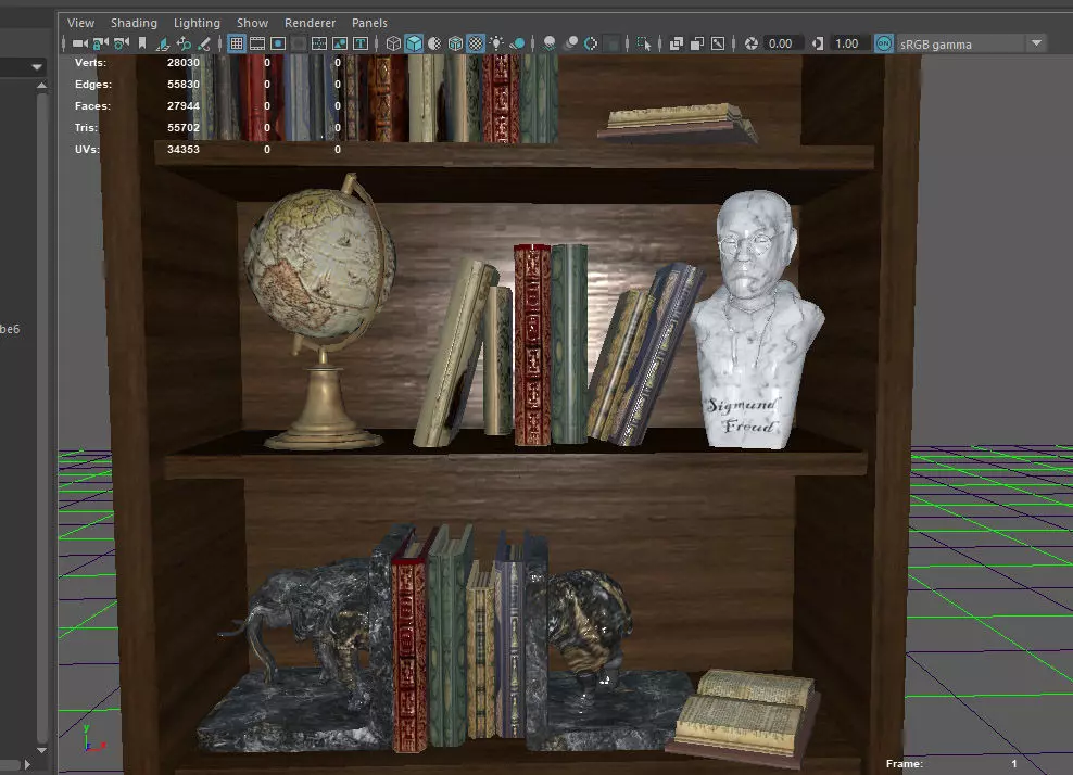 PBR Full Bookshelf, FBX Maya, Elephant bookends ( able to be 3D printed just contact me!), Statue of Sigmund Freud (able to be 3D printed just contact me! same price), Bookshelf, and Globe! Thank You