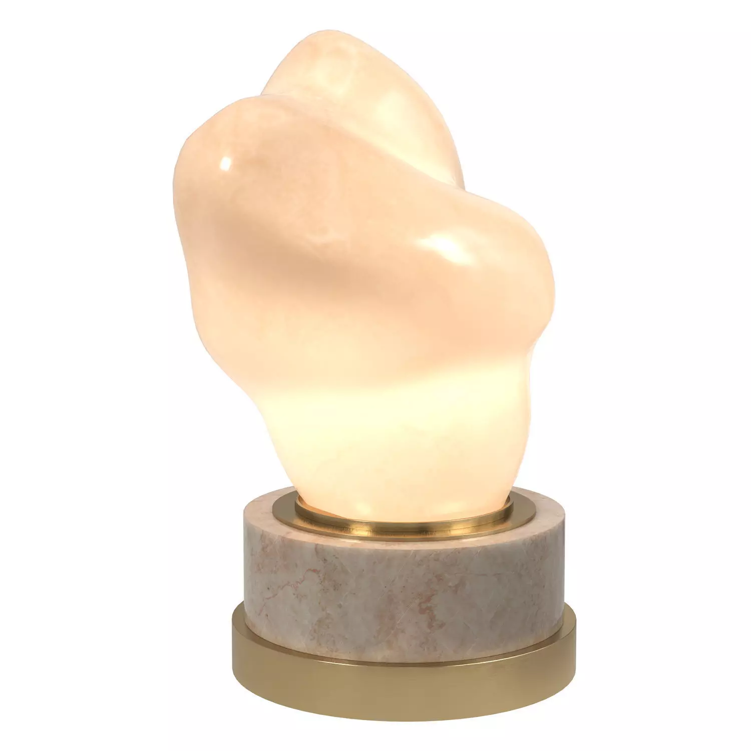 Features:Sculptural table lamp with organic onyx formSoft internal light diffusion through natural stoneMarble base with brushed brass accentsStrong artistic and contemporary identity