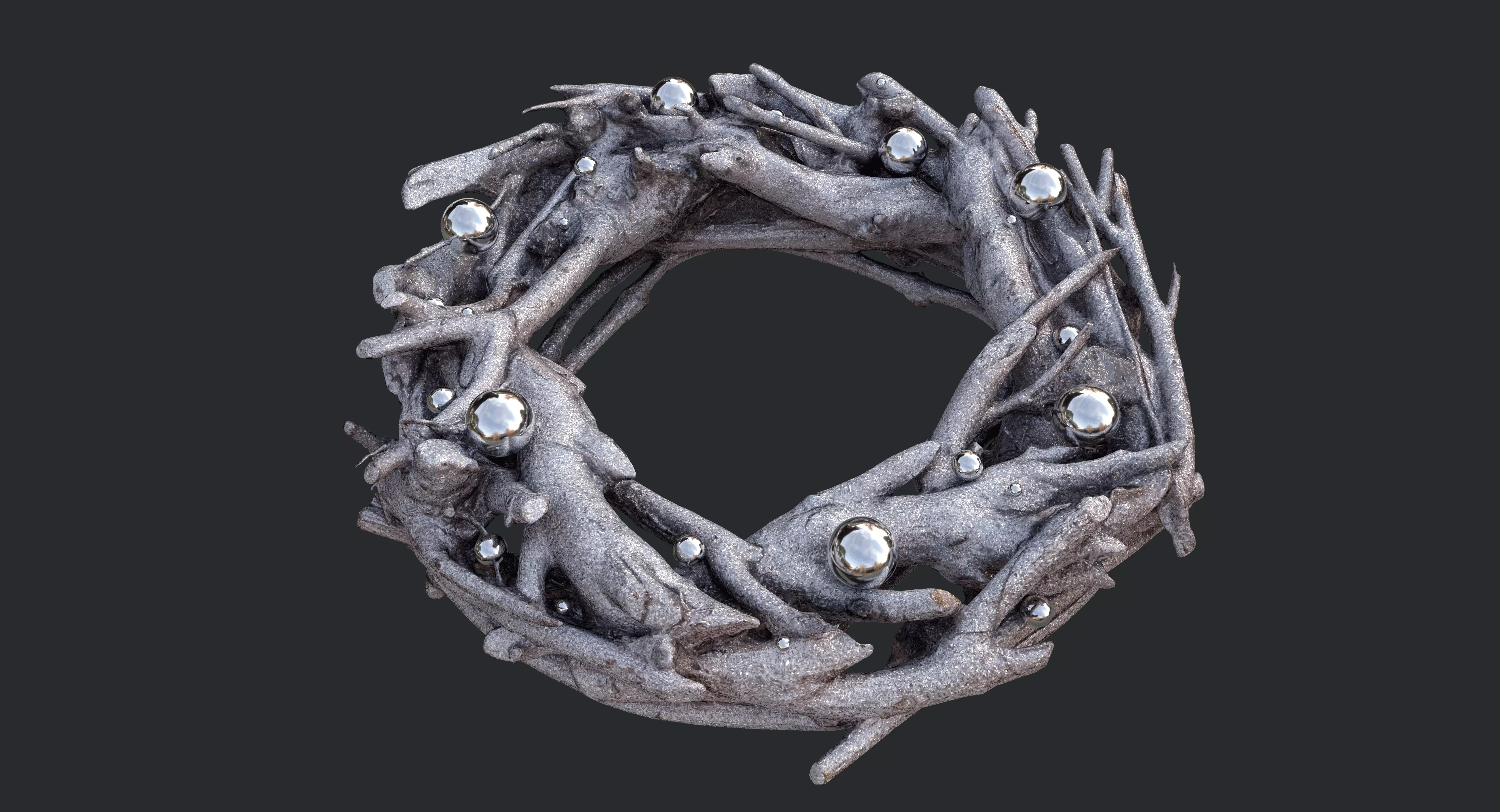 This 3D model of a Sparkling silver glitter wreath features exquisite detail and realism, thanks to advanced photogrammetry and careful sculpting in ZBrush. The silver glitter adds an elegant, festive touch, making it perfect for holiday decorations or stylish visual projects.