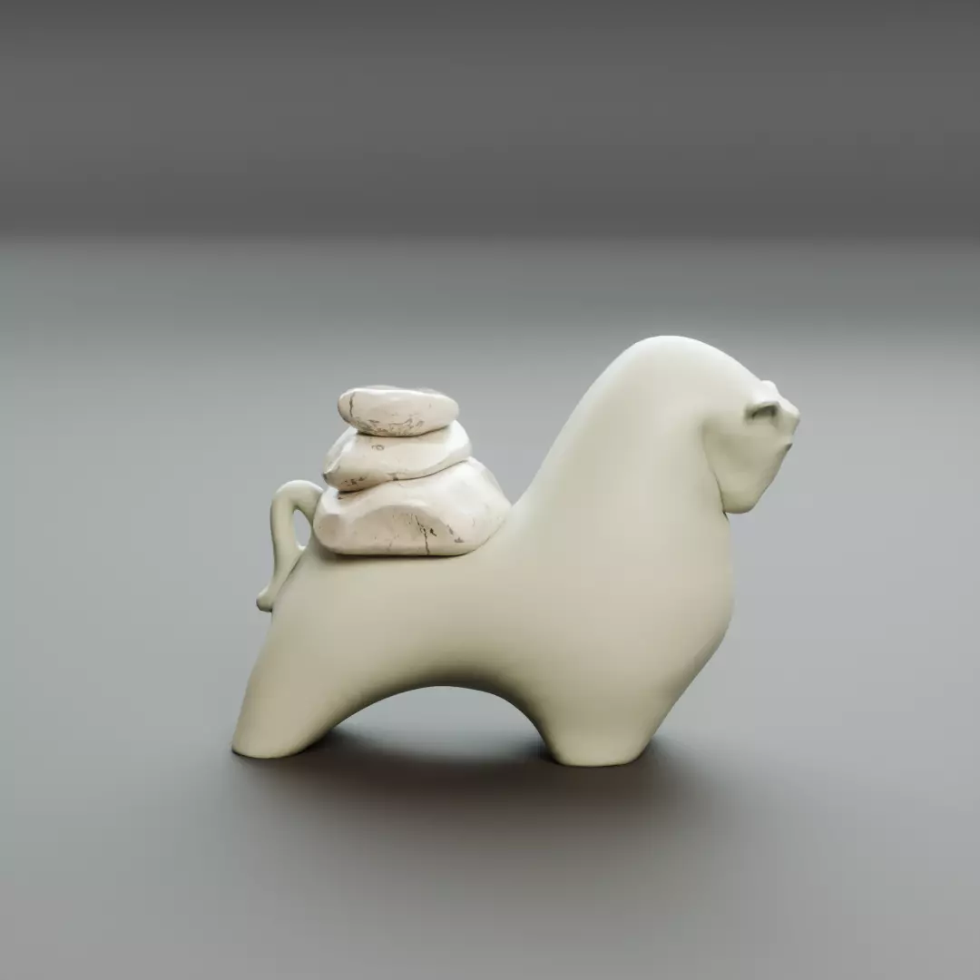 High-quality stylized 3D model of a ceramic horse figurine with smooth rounded shapes and decorative stacked stones placed on its back. This version features a clean side-profile design, perfect for interior visualization, product renders, games, and stylized scenes.