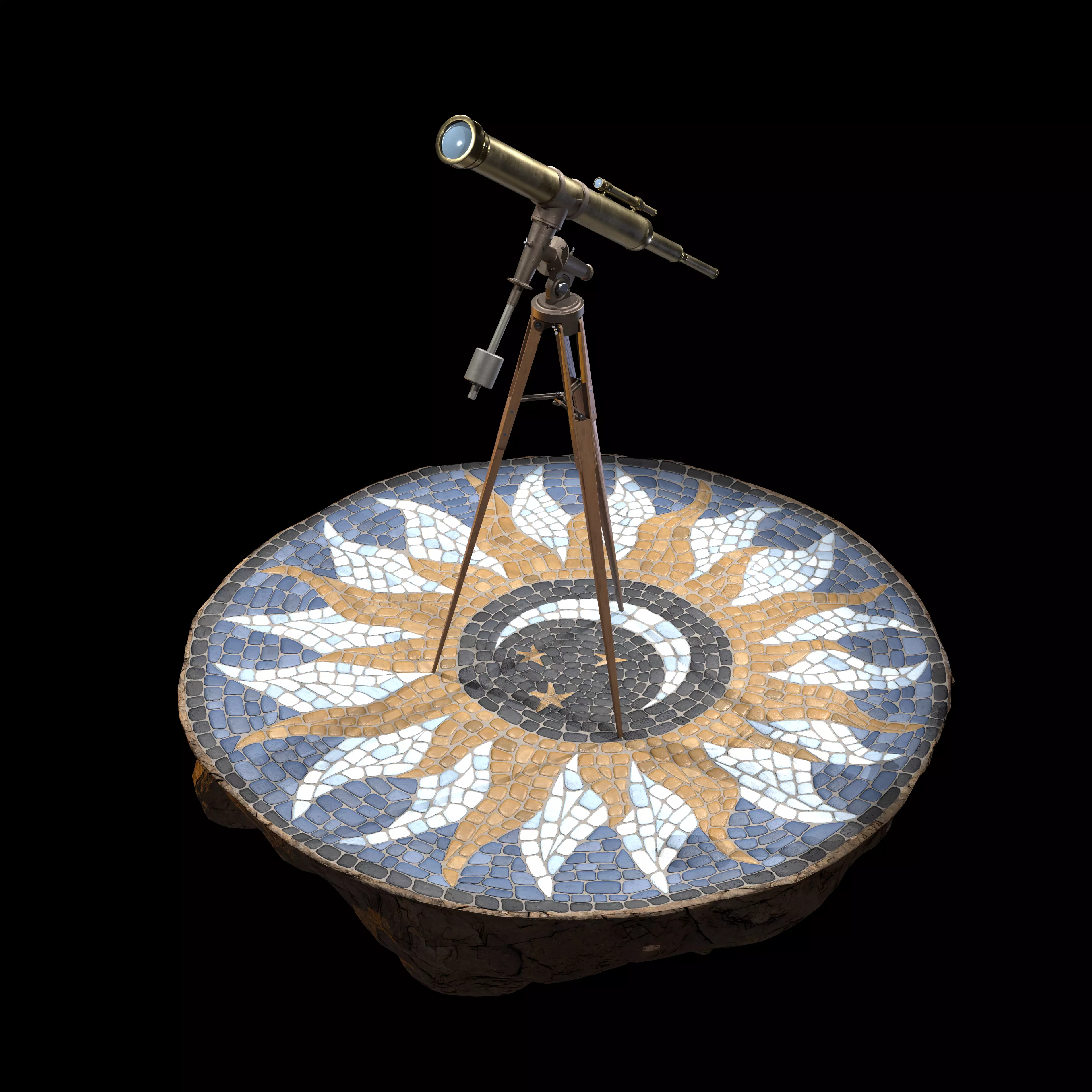 This stylized 3D model features a vintage brass telescope mounted on a wooden tripod, placed on a beautifully detailed mosaic platform with celestial sun and moon patterns. Ideal for fantasy scenes, magical observatories, educational visualizations, or steampunk-inspired environments.