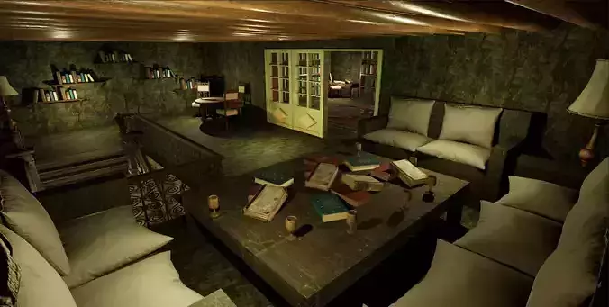 There is a highly detailed 4k vintage three rooms house. This house consists of 3 rooms. In the first part of the ground floor, there is a section with clothes and shoe cabinets around the door. In the second part of the ground floor, there is a fireplace made of natural stone and a large dining table. The first floor can be reached by a magnificent staircase made of wood. In the first part of the 1st floor, there are bookshelfs, books and a round table and 3 chairs hanging on the wall. Directly opposite there are 3 large sofa sets and a large desk with various coffee cups and glasses on it. The second part of the first half is the library room of the house. There is a magnificent green door at the entrance of the room. When we enter the room, we are greeted by bookcases covering two walls, a small desk and a fireplace made of natural stone. I'm new to this platform, please support me.