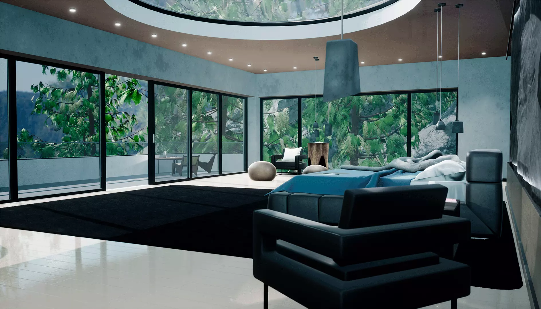 This pack is well suited for creating games, virtual reality projects and simulators. The complete scene shown in the images is included in this pack, and it can be used as a starting point in your games and 3D projects. ** Key Features** high quality modern interiordetailed exterior with trees, grass and rocksgame ready demo scene *Assets *Building.Interior: 2 armchairs, books, bookshelf, bed, lamp, nightstand, pillow, blanket, mirror, sick, carpet, coffee table, lamps.Exterior: terrain, 3 types of trees, grass, bush, 7 types of rock.
