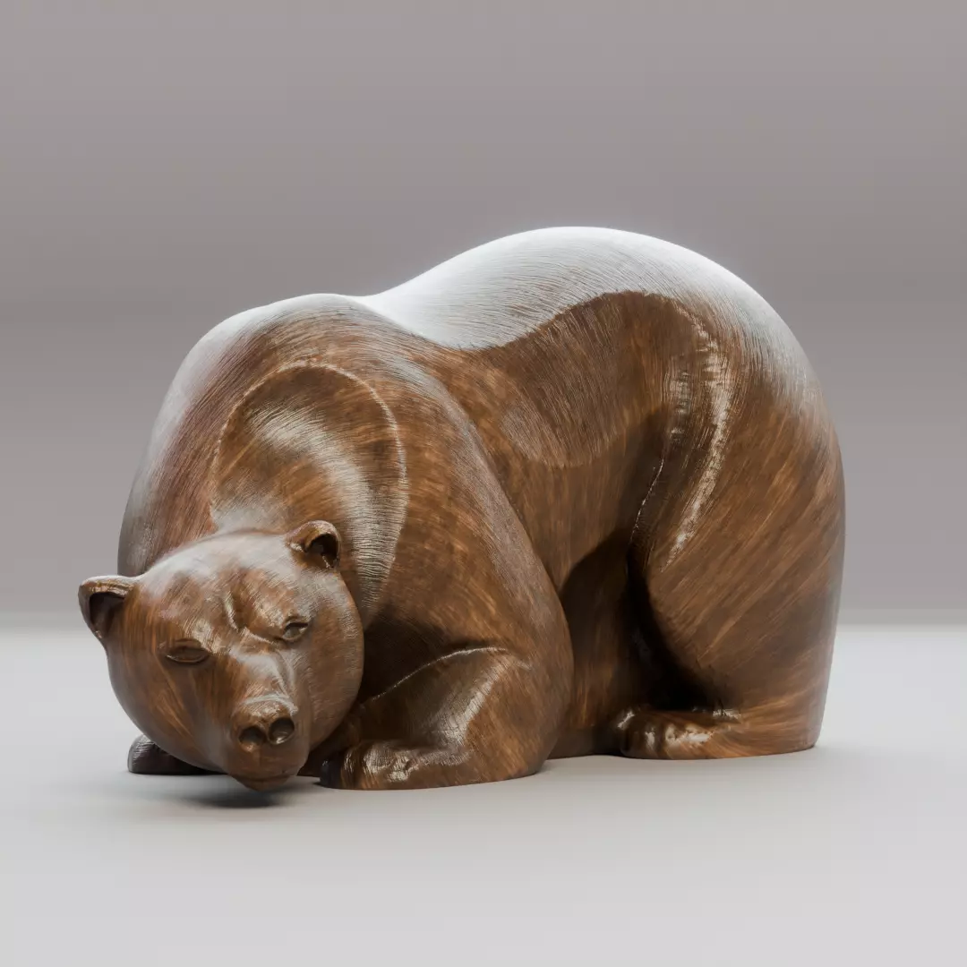 The bear is posed in a low, natural, grounded stance that gives character and presence to the model. Materials are fully set up with realistic wood grain and subtle gloss variation.