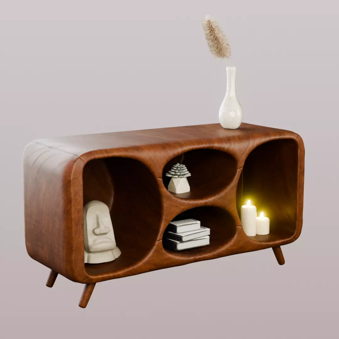 This elegant stylized console table features an organic, sculpted wooden form with smooth curved edges and rounded shelves. The model includes three organically carved storage compartments, ideal for placing books, candles, vases, or decorative sculptures. The surface showcases a polished wood texture with soft highlights, giving it a warm and modern aesthetic perfect for interior visualization scenes.
