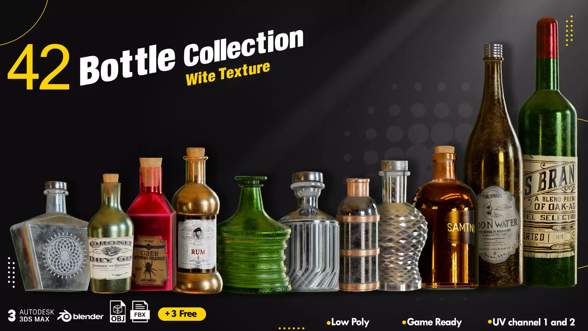 This pack includes 42 high-quality bottle models designed for a wide range of creative projects. All models are Low Poly, fully Game Ready, and come with clean UVs (Channel 1 & 2). The collection is delivered in multiple formats (.FBX, .OBJ, Blender, 3DS Max) plus 3 bonus free models.