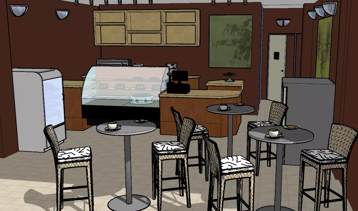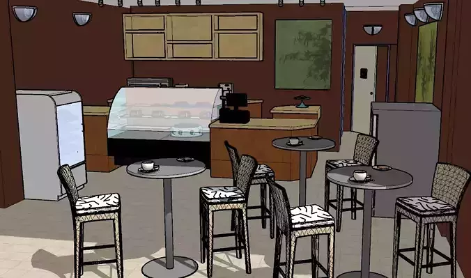 STATISTICS:This model includes Kitchen Appliances, Coffe mug and saucer, pastry display case, tables, chairs and textures.