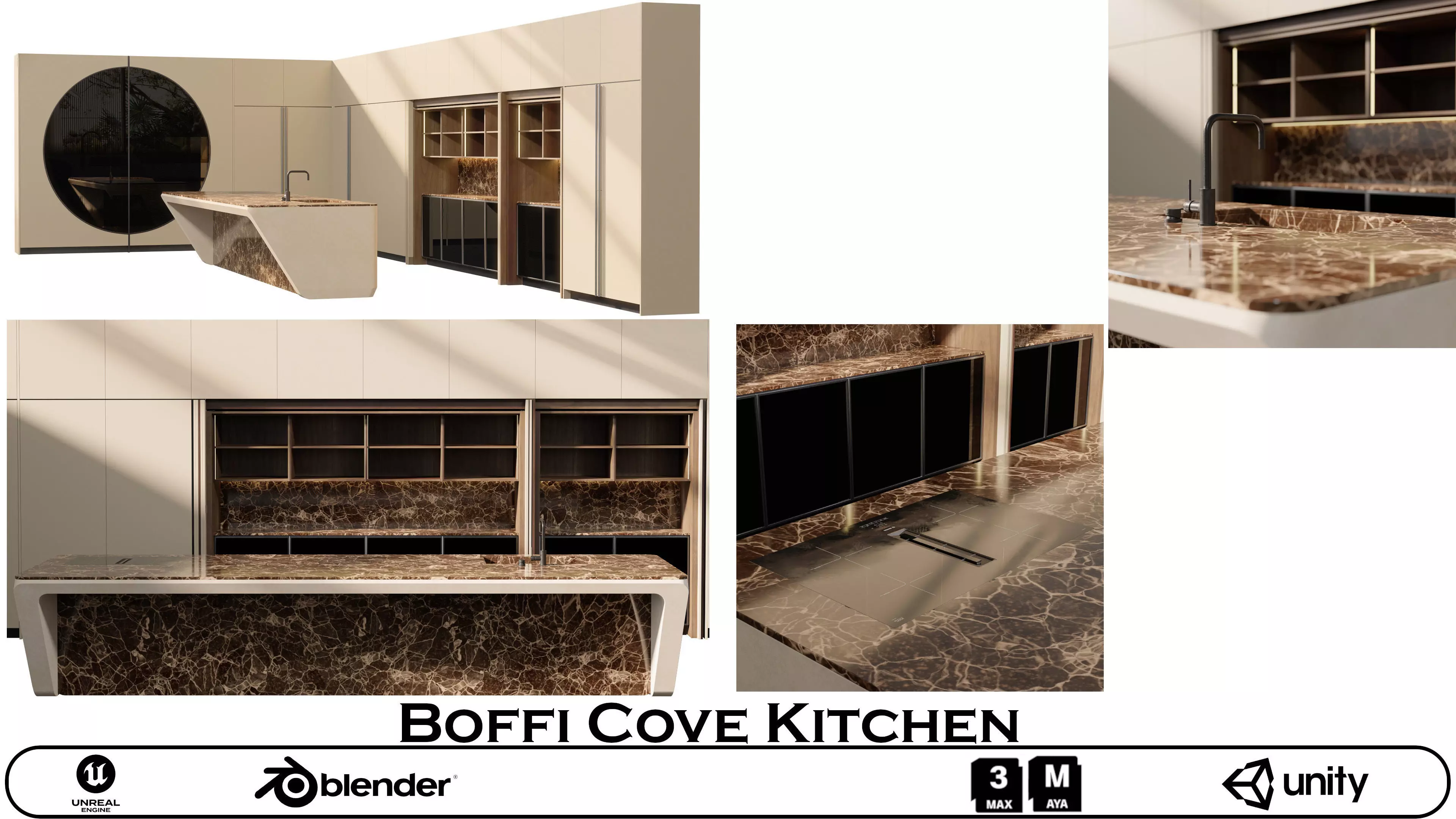 A luxurious and modern kitchen environment inspired by the iconic Boffi Cove design. This high-fidelity model was created in Blender, with all materials and textures carefully crafted in Substance 3D Painter. Rendered in V-Ray for photorealistic quality.