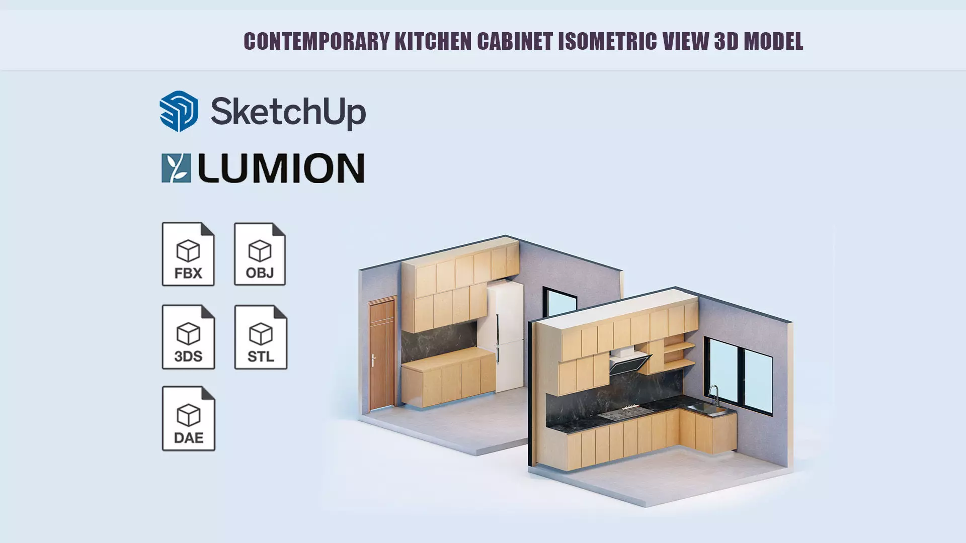 Contemporary Kitchen Cabinet isometric view 3d interior is an ideal learning tool. The kitchen 3d is in standard size in feet and inches. All materials have been applied in Lumion file. This High poly kitchen interior model is perfect for animations, games, advertisements and presentations. It can be easily reused and altered as the files are clean and well grouped. Model axis point is set in the middle so it can be animated easily.