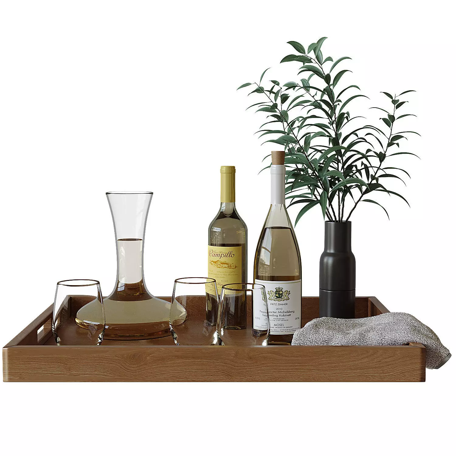 Decorative set on a tray with a decanter, bottles of wine and olive branches.Tray: CRATE & BARREL Código Bandeja Willoughby Grande.Dimensions: 61x45.7x5.1 cm