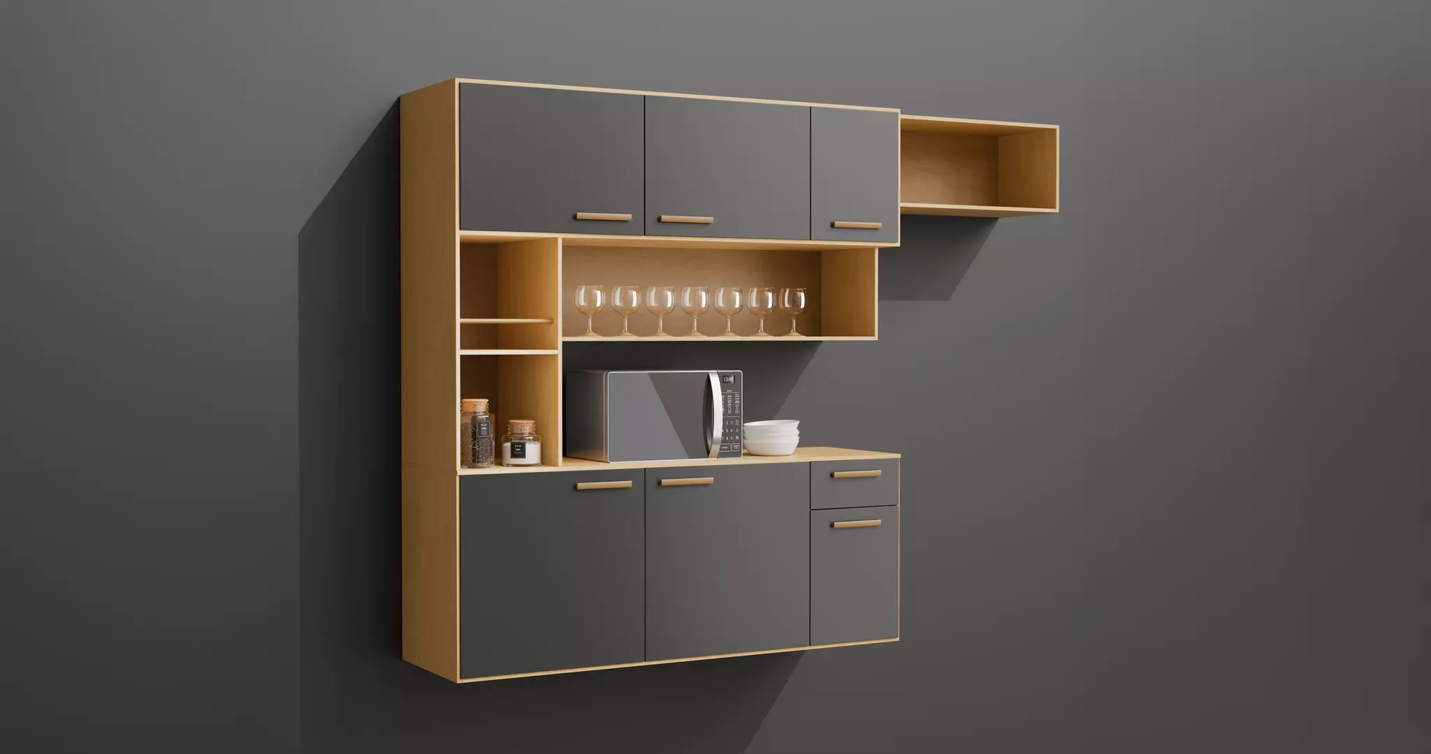 This is a high-quality, modern Hanging Kitchen Cabinet model designed for premium Architectural Visualization (ArchViz) projects. The model features a natural wood structure contrasted with sleek, dark-finish doors, creating a contemporary and elegant look.