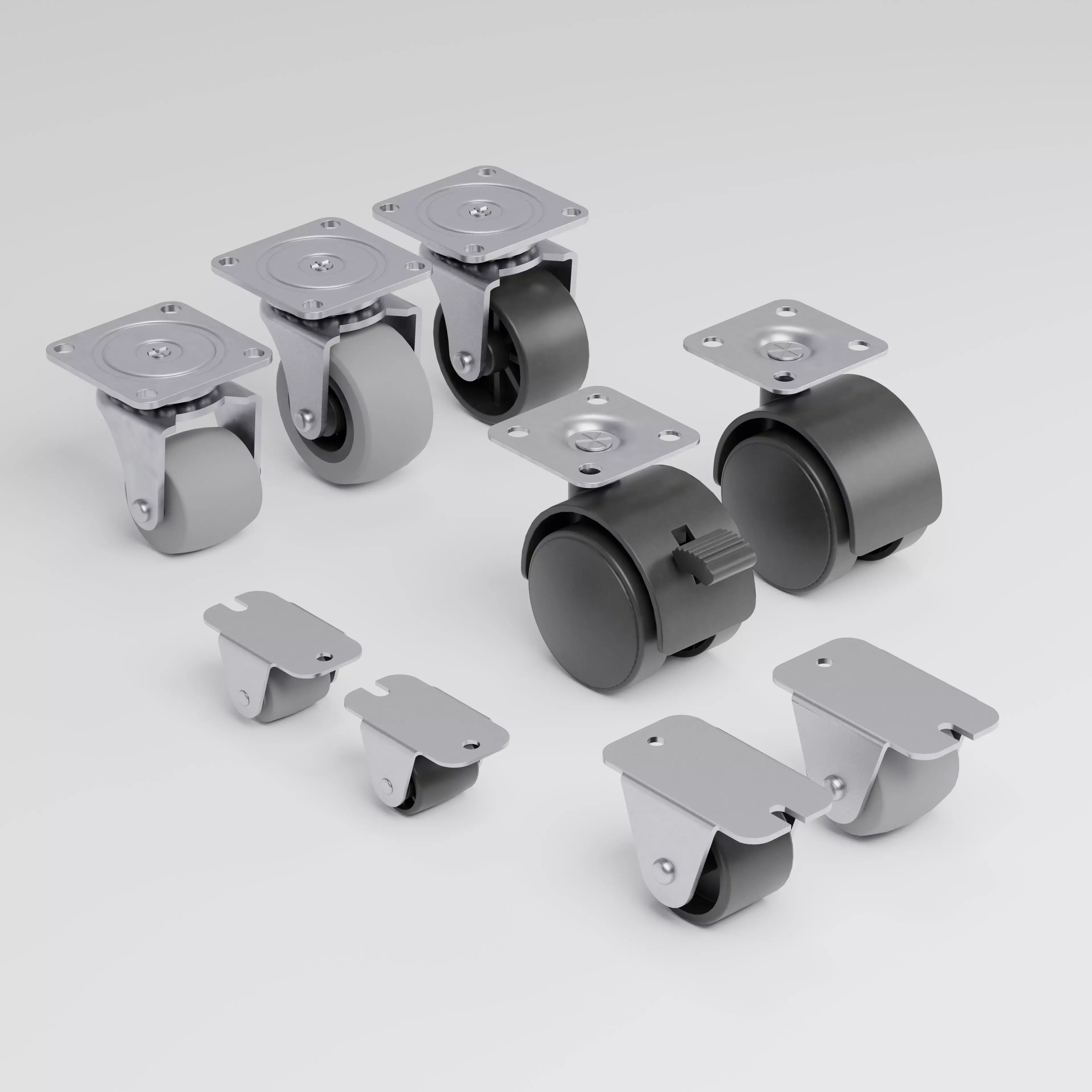 High-quality set of 9 furniture caster wheel 3D models, designed with realistic proportions and detail.